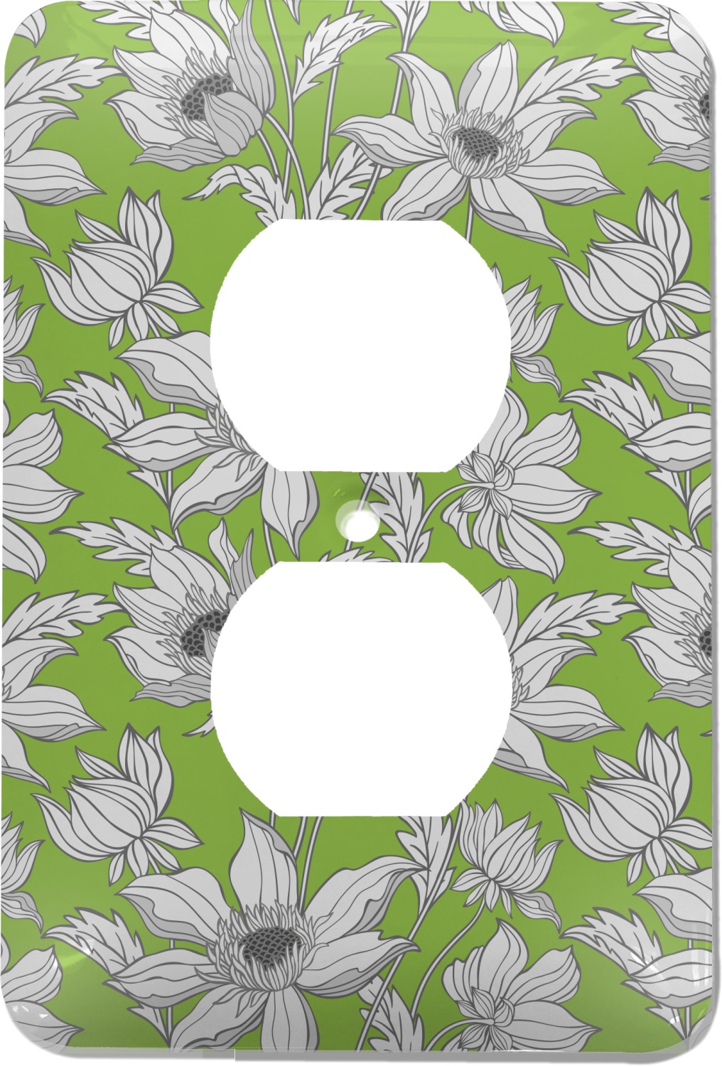 These outlet covers are made from a sturdy metal and display your design across its face. A satin finish coats the design to give it a finished look. The center of this outlet plate cover has a small hole to accommodate a screw upon installation. With your purchase of this decorative outlet cover, we include one screw. This outlet plate is of a standard size, and measures at approximately 3.5 by 5 inches.