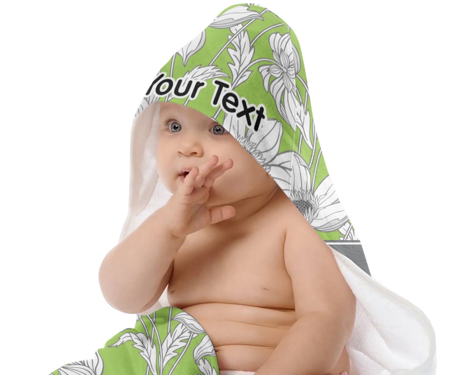 This baby towel is made with a plush microfiber velour and cotton terry. and thus will be soft and gentle against your newborn's skin, but also, very absorbent. Your customization is printed across the front & the hood, while the inside is a classy white.