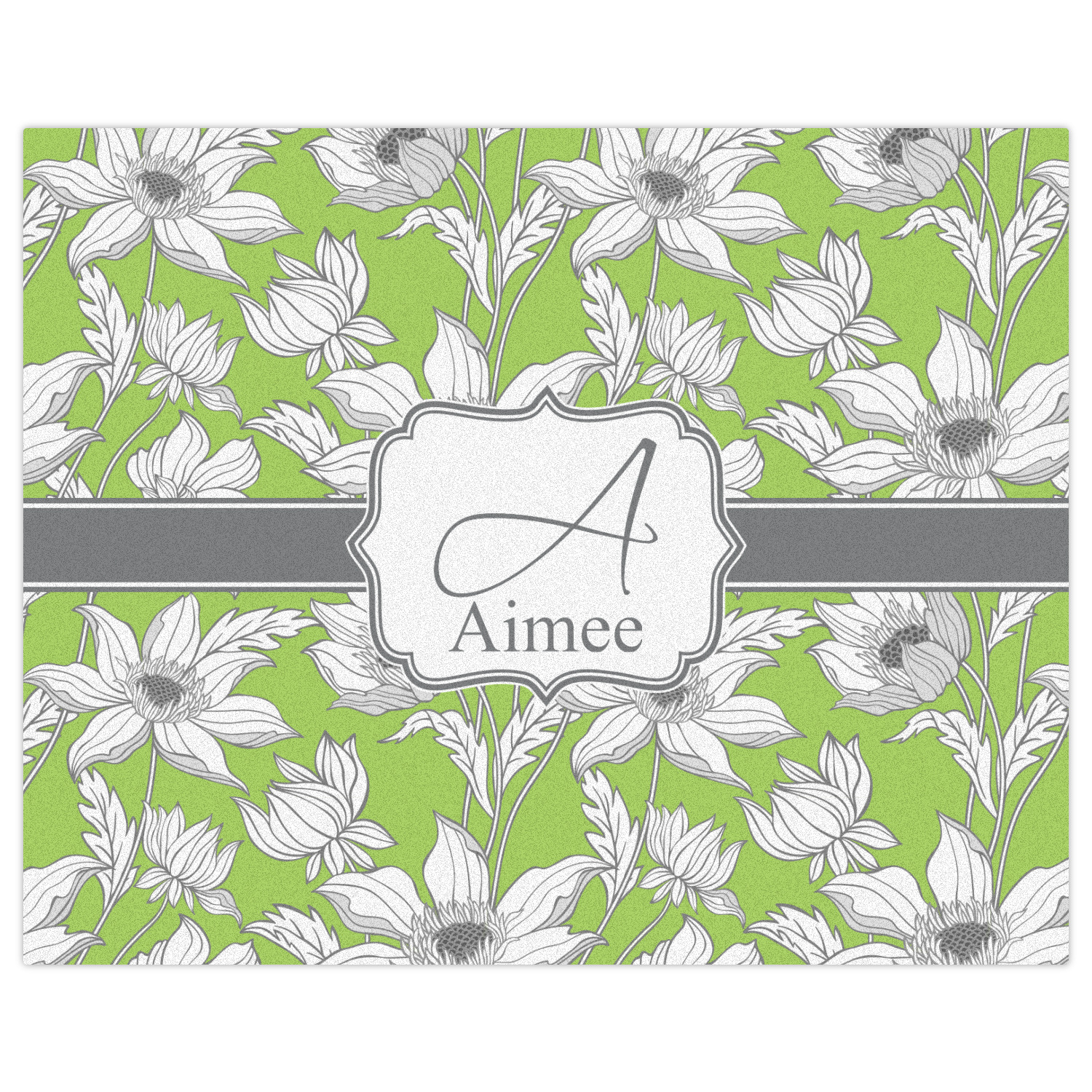 Sketches of long stem white daisies outlined in gray spring to life up against a green background. A white trimmed gray ribbon coordinates with a decorative label to showcase the personalization of your choice.