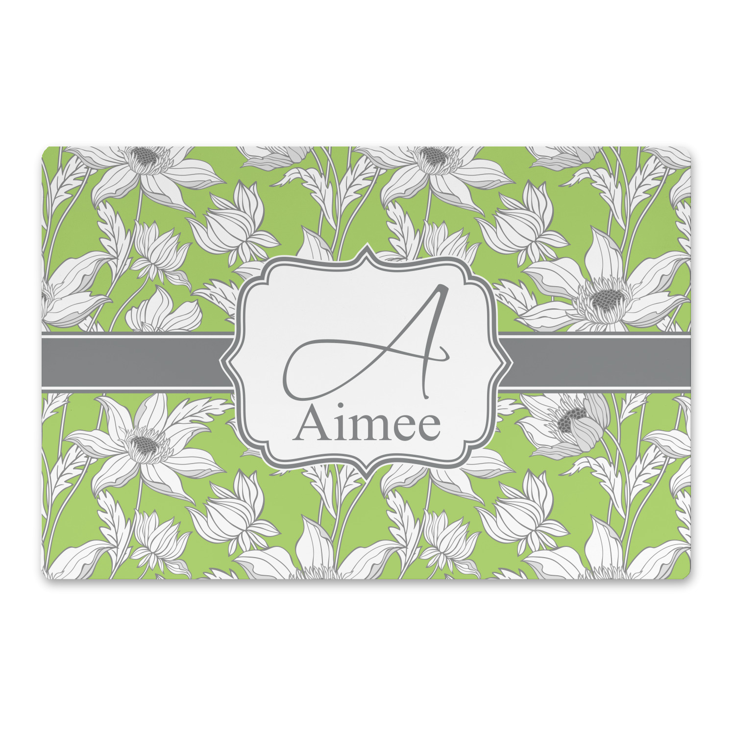 Sketches of long stem white daisies outlined in gray spring to life up against a green background. A white trimmed gray ribbon coordinates with a decorative label to showcase the personalization of your choice.