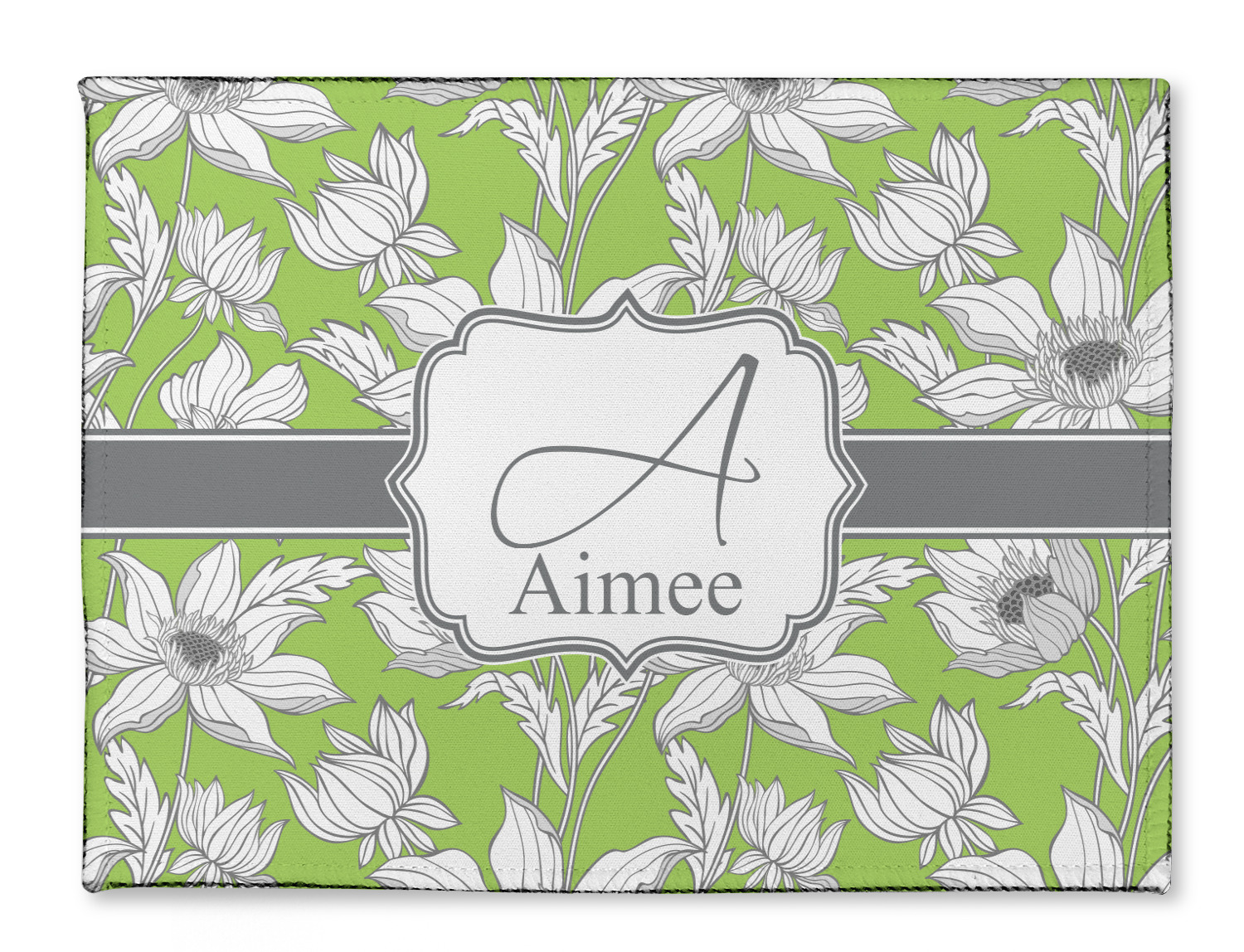 Sketches of long stem white daisies outlined in gray spring to life up against a green background. A white trimmed gray ribbon coordinates with a decorative label to showcase the personalization of your choice.