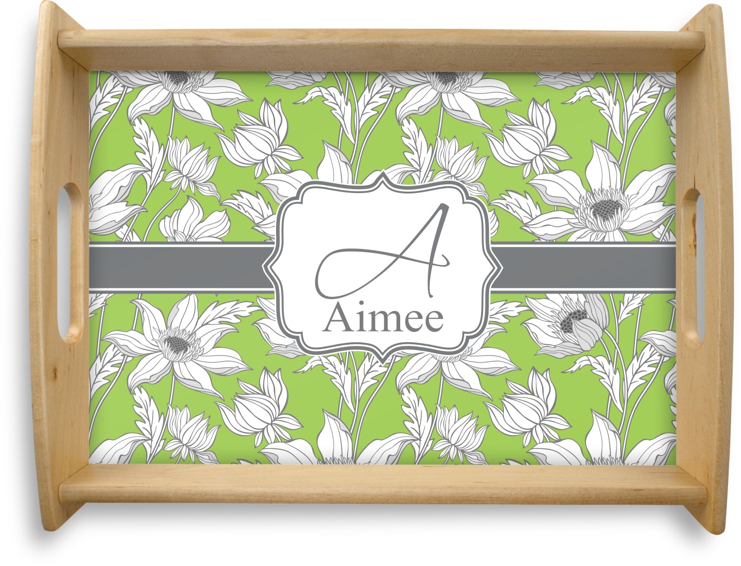 This serving tray with handles features square edges and two rounded sides, creating a very modern look. Each side is fabricated from a beautifully cut, natural wood. The bottom of the interior of the tray displays your customized design in bright, vibrant color. The tray is sold in both a black color and a natural wood look. Each variation of the wood serving tray has two sizes: Small, which is 14" x 10" x 2.25", and Large, which is 19.5" x 13.5" x 2.75".