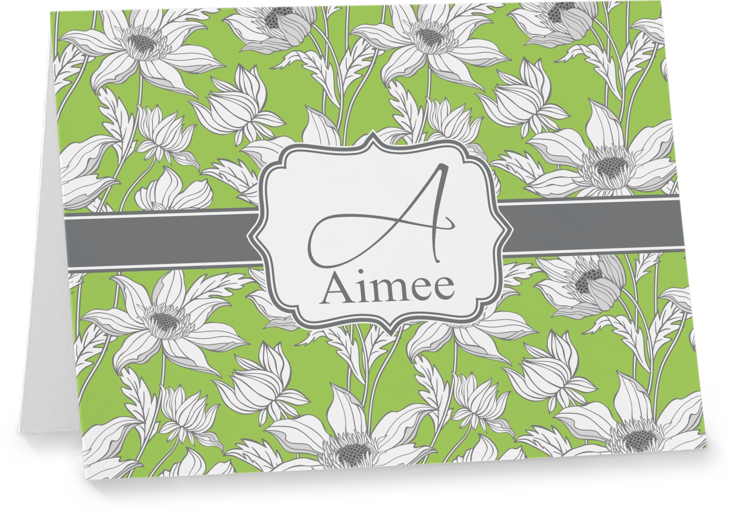 Our custom folded note cards are printed on premium 100lb. card stock and comes with white envelopes. The note card measure 5.5 by 4.25 inches and are blank on the inside for your handwritten message.