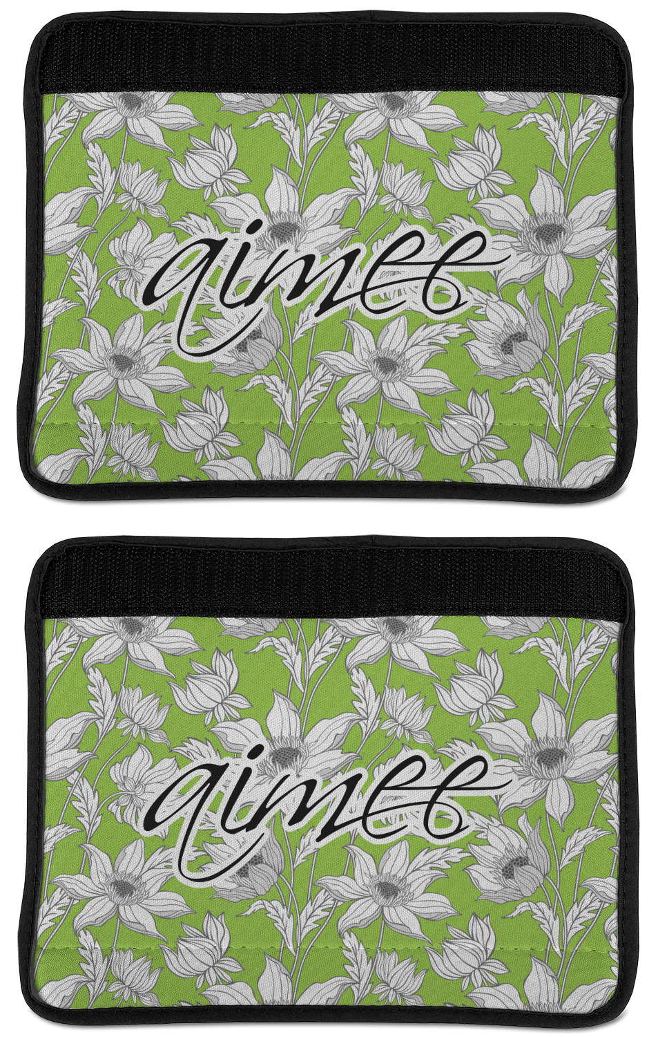 Made from neoprene, our seat belt strap covers wrap around the belt itself and have a Velcro tab for easy attachment and closure. The belt's edges are trimmed with a black polyester for a secure finish. Each cover is 9.5 by 7 inches when open and 9.5 by 2.5 inches when closed. We print your personalized design on the face of the seat belt pad.