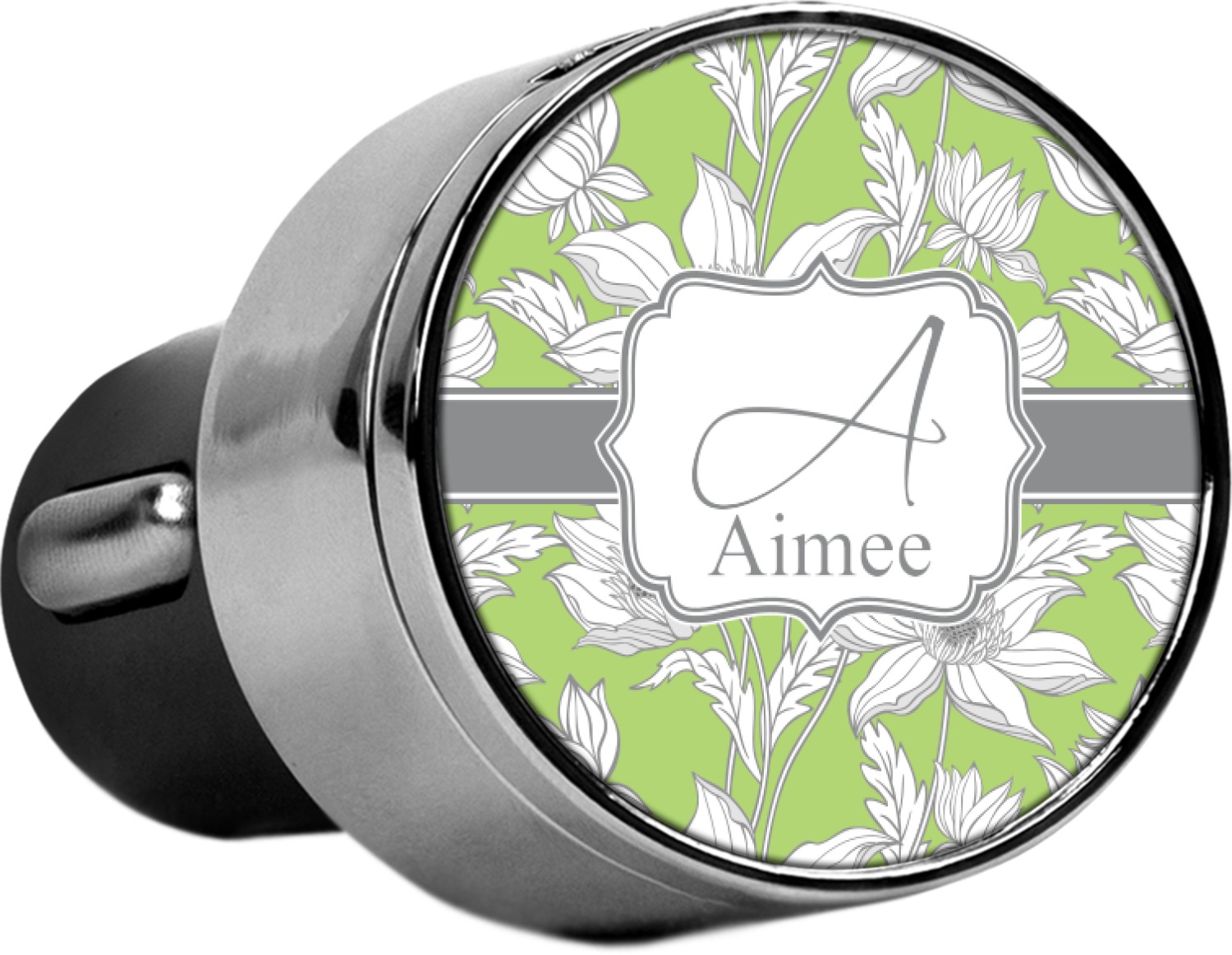 This car charger adapter converts your cars bland cigarette lighter into a decorative, personalized, and operational USB charging port. Made of solid, silver-plated metal, these chargers feature a flip-open lid that both displays your customized design and conceals two USB ports. The metal lid of the USB car charger adapter is 1.5" in diameter and seals due to a small, ingrained magnet on both the charger and its lid. The cigarette lighter insert, itself, is colored black.