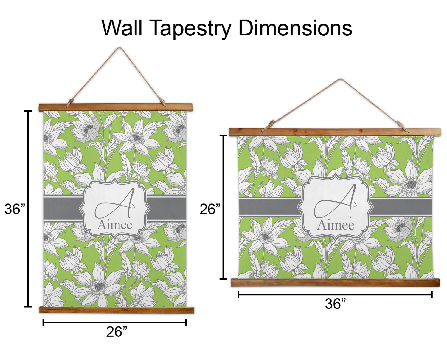 Made in two different orientations - portrait or landscape - both are 26" x 36". Your design is printed on a high quality polyester fabric with hemmed edges. The wood on the top and bottom of the tapestry is 1.25" tall and 0.25" thick and there are two pieces on top and bottom which sandwich the fabric.