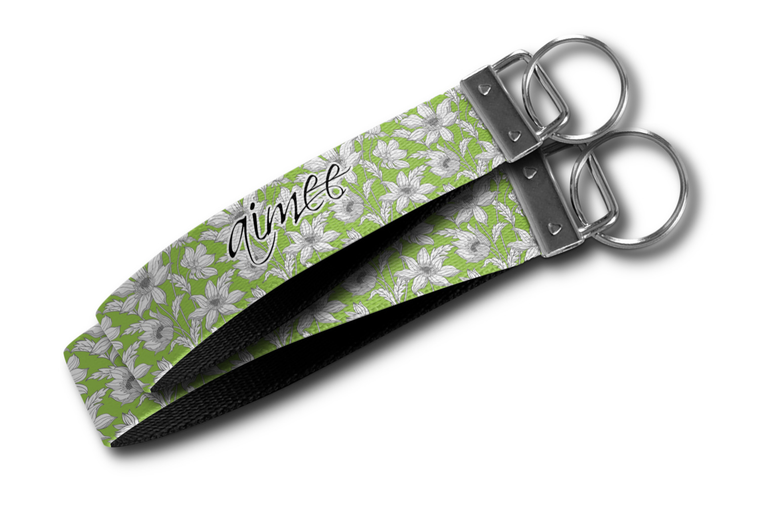 These key fob keychains are made from a polyester weave, right here in the USA. They feature a silver, metal clasp, attached to a round keyring. The piece gives the personalized wristlet a beautiful, finished look. Your customized design is printed on the outside of the keychain strap. We carry these wristlets in two sizes: small, which is 5 inches in width, and large, which is 5.5 inches in width.