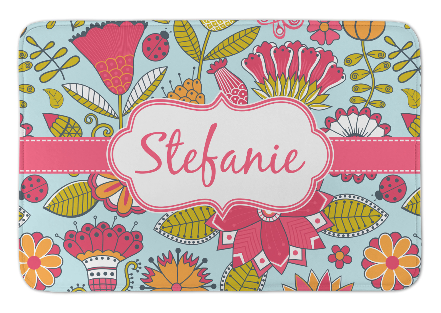 A pink ribbon with white stitching attached to a decorative white label trimmed in pink ties the entire design together. Add personalization of your choice in a coordinating color to make this pattern even more special.
