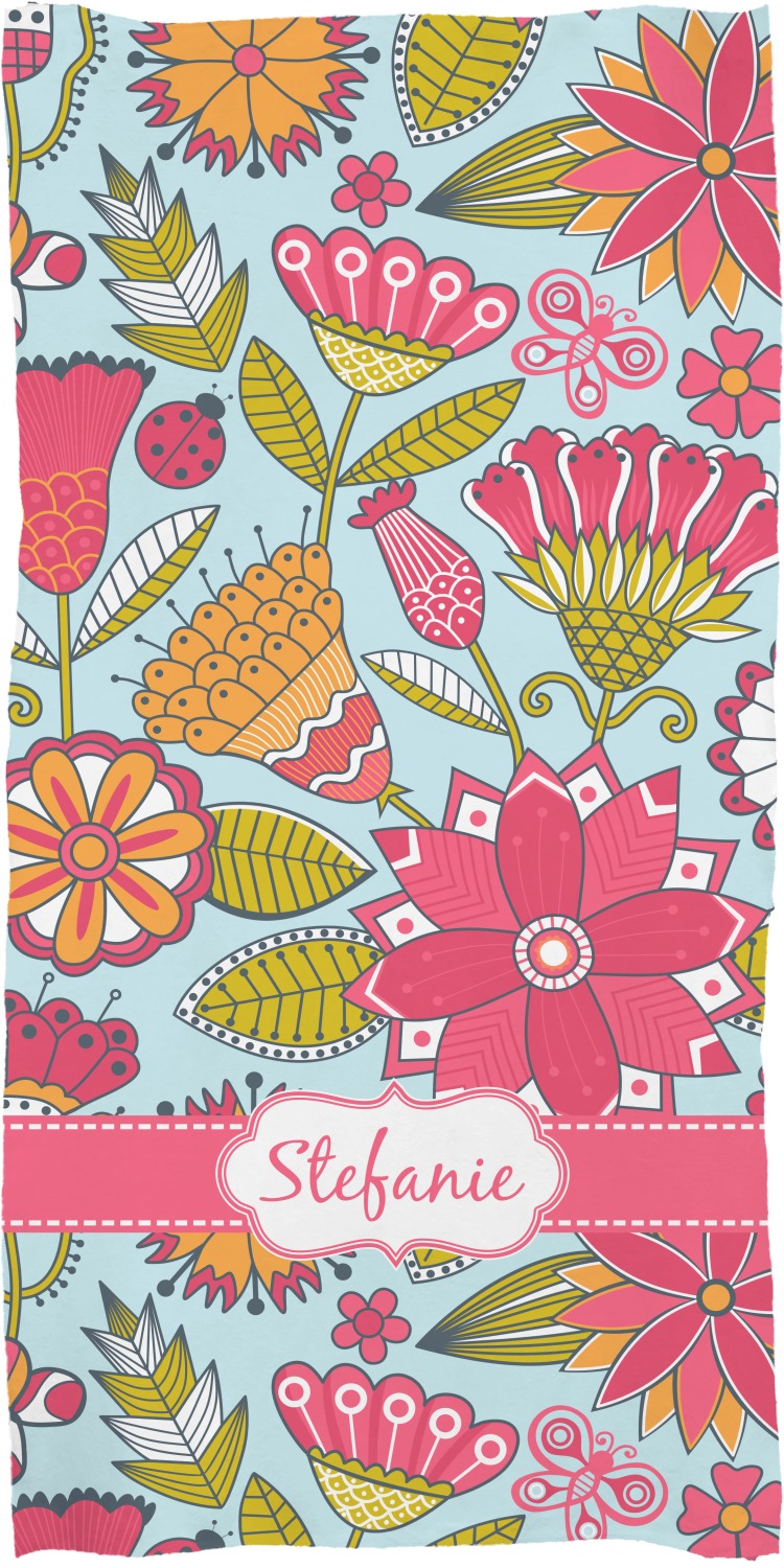 These customized bath towels are slightly larger than your standard towel and are the ideal size for wrapping around your body. They measure approximately 60" x 30". Your customization is displayed across the entire front face of the towel, while the back is white.