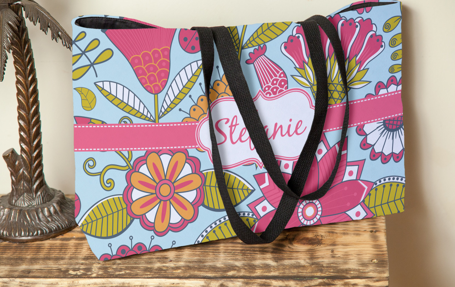 These beach totes are handmade here in the USA. Fabric is printed with your design. The tote is then sewn from the fabric pieces, lining and handles added.