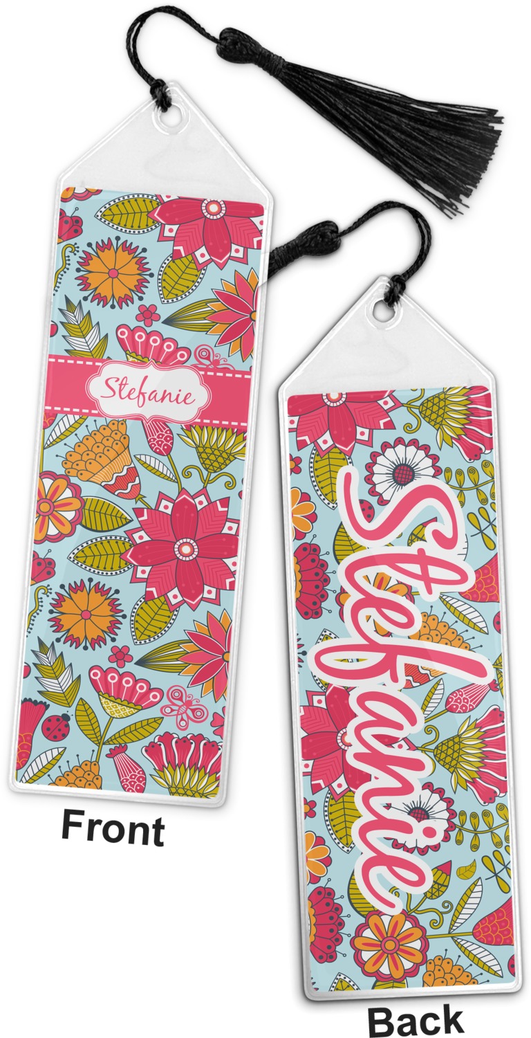 Your personalized bookmark is made of a sturdy, clear vinyl, and is approximately 7.5" x 2.25". We display your personalization on vinyl inserts that are placed on both sides. Accompanying each book marker is a black, fringe tassel that attaches to the reinforced, triangular header.