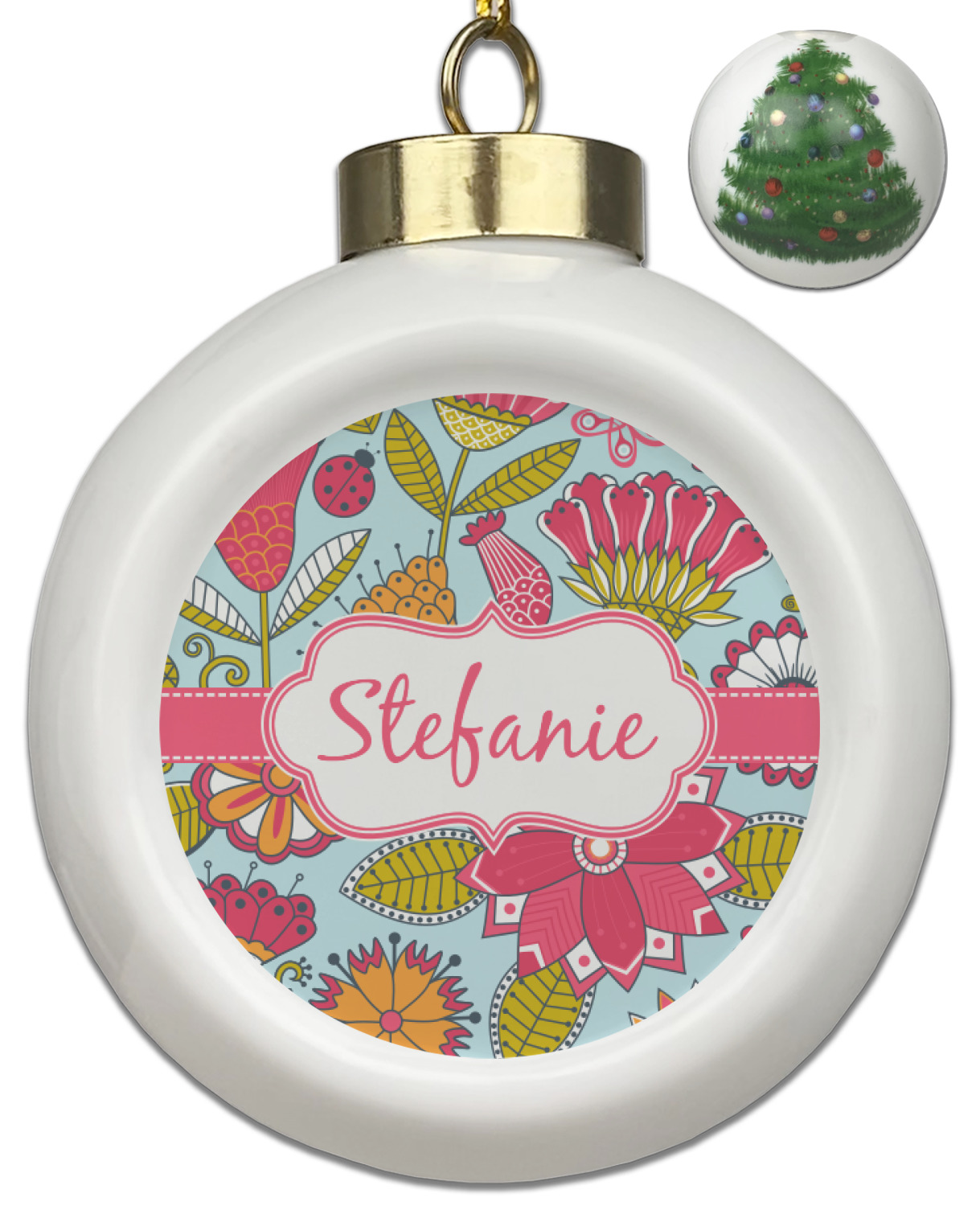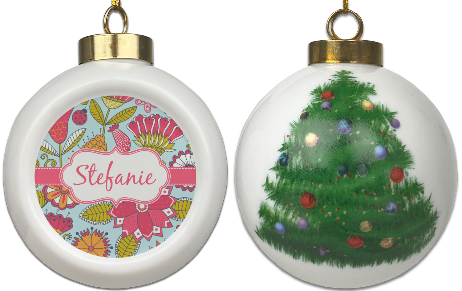 Our Christmas ornaments are a unique ceramic ball shape with a twist as it has a flat face to display your custom design! Select from one of our two design types - Christmas Tree or Poinsettia Garland - to adorn the curved back of your personal design. Each ornament measures 3H x 2.5W x 2D accompanied with a gold string accent for finishing touches to hang on your beautiful Christmas tree!