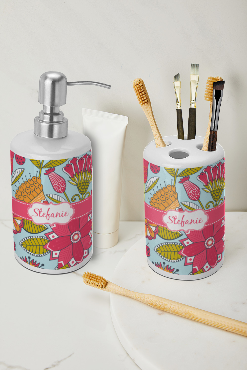 This two piece, ceramic bathroom set will add the perfect splash of color to any bathroom. This set includes one pump dispenser, ideal for soap or lotion, and one toothbrush holder with four holes. Although originally designed for toothbrushes, the holder will also hold make-up brushes, nail files, and other bathroom tools.
