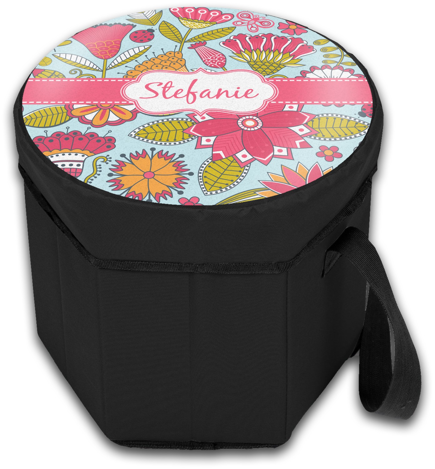 Our collapsible insulated coolers feature a unique six-sided hexagon shape, are lightweight, durable and can be turned into a seat. This cooler is fully insulated with silver foil lining to keep food and drinks hot or cold, and has a 12-quart capacity. Although this cooler collapses for easy transport, hidden inside are composition panels made of sturdy wood that give the frame strength and allow this cooler to be used as a seat. Simply sit down on the personalized cover and give your legs a break! (Maximum weight capacity of 200 pounds.)