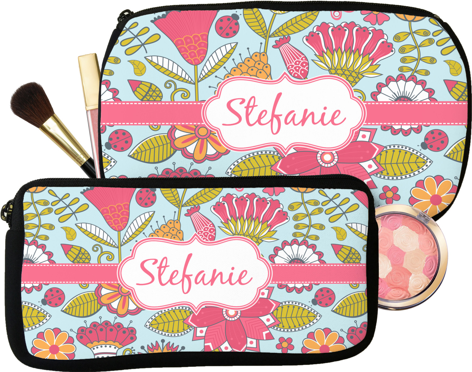 Our personalized makeup bags are available in many different designs, patterns and colors - so you are sure to find one that will love. They are made of neoprene (same material as wet-suits) and thus are water resistant, so spillages in your makeup bag will not end up all over you purse. They are customized on one side and are black on the other side and the zipper is black as well.