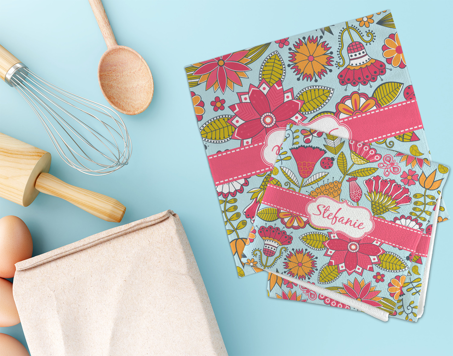 A pink ribbon with white stitching attached to a decorative white label trimmed in pink ties the entire design together. Add personalization of your choice in a coordinating color to make this pattern even more special.