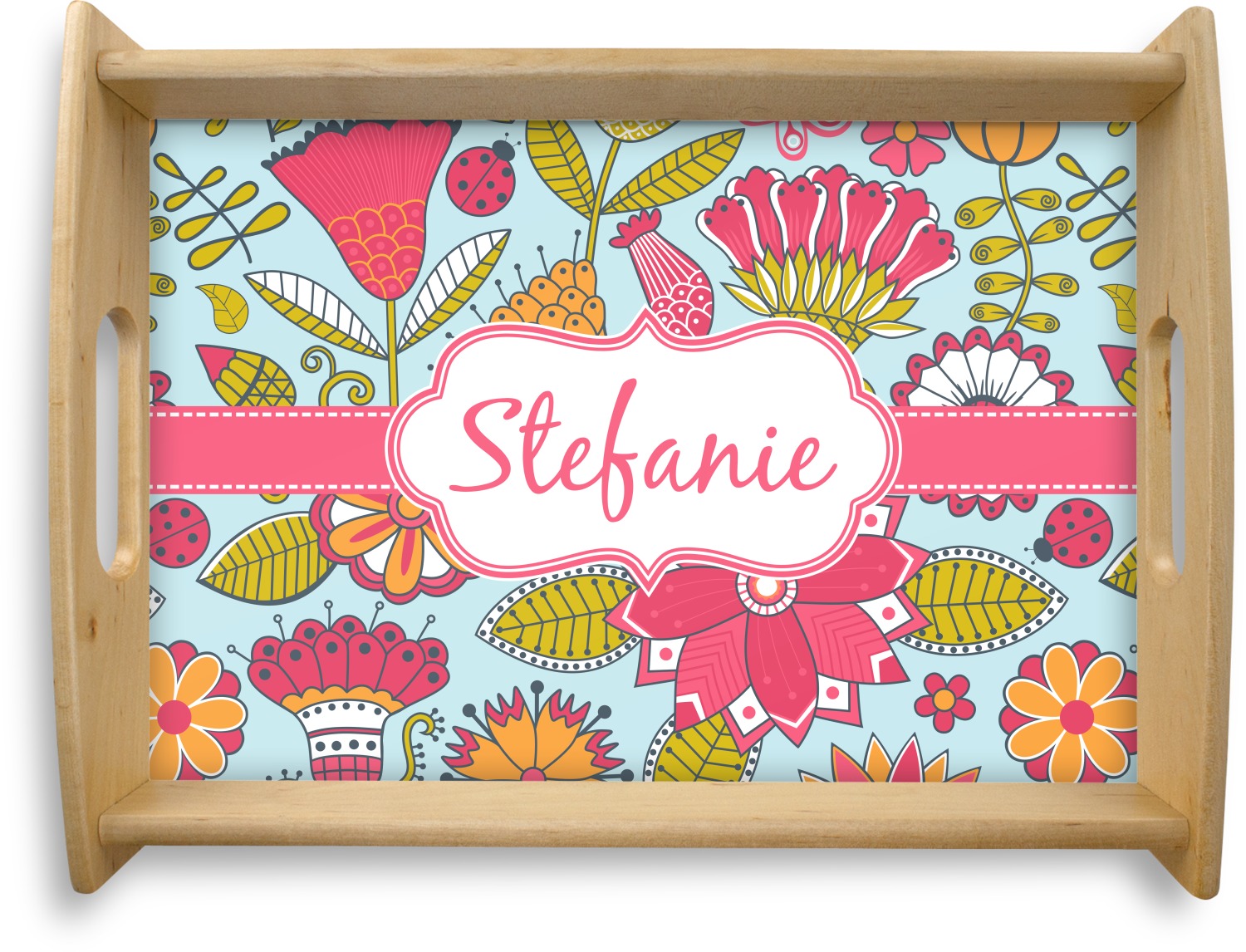 This serving tray with handles features square edges and two rounded sides, creating a very modern look. Each side is fabricated from a beautifully cut, natural wood. The bottom of the interior of the tray displays your customized design in bright, vibrant color. The tray is sold in both a black color and a natural wood look. Each variation of the wood serving tray has two sizes: Small, which is 14" x 10" x 2.25", and Large, which is 19.5" x 13.5" x 2.75".