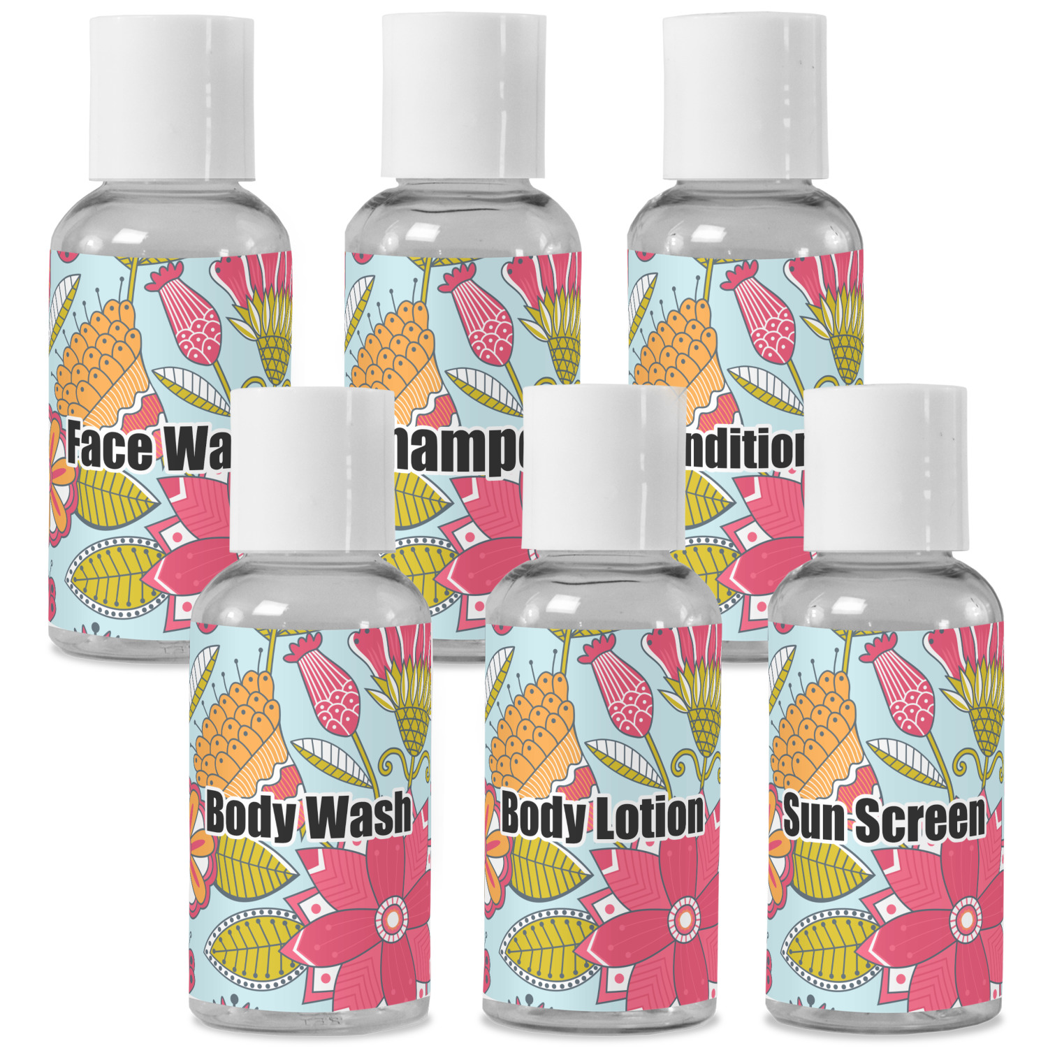 These soap and lotion travel bottles are the perfect place to start. Each set comes with 6 clear plastic bottles with white pop top lids. The bottles are cylindrical and can hold approximately 2.7oz. Perfect for plane travel!