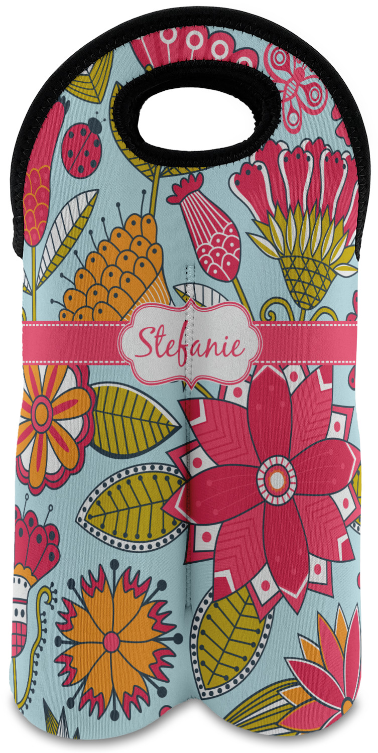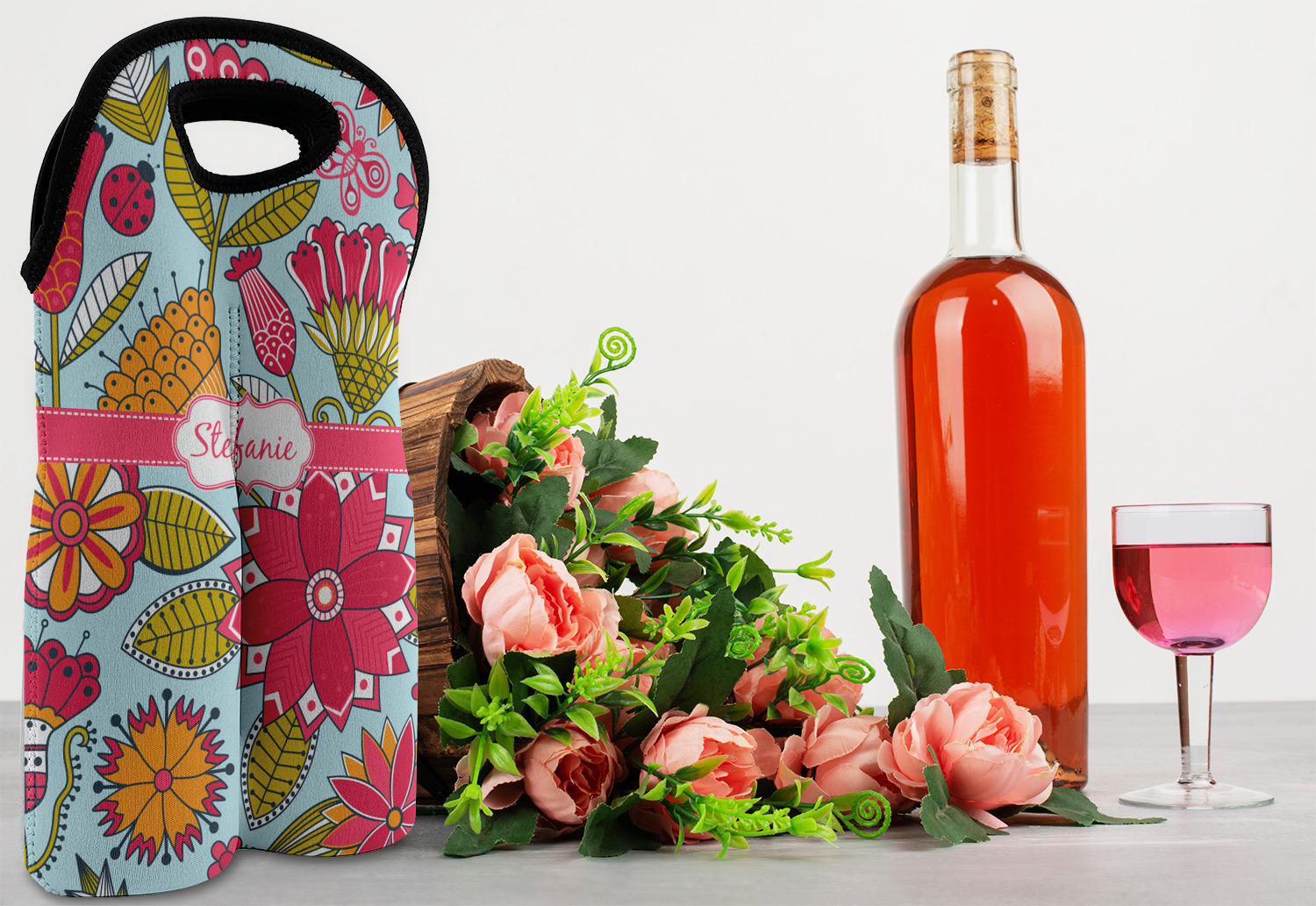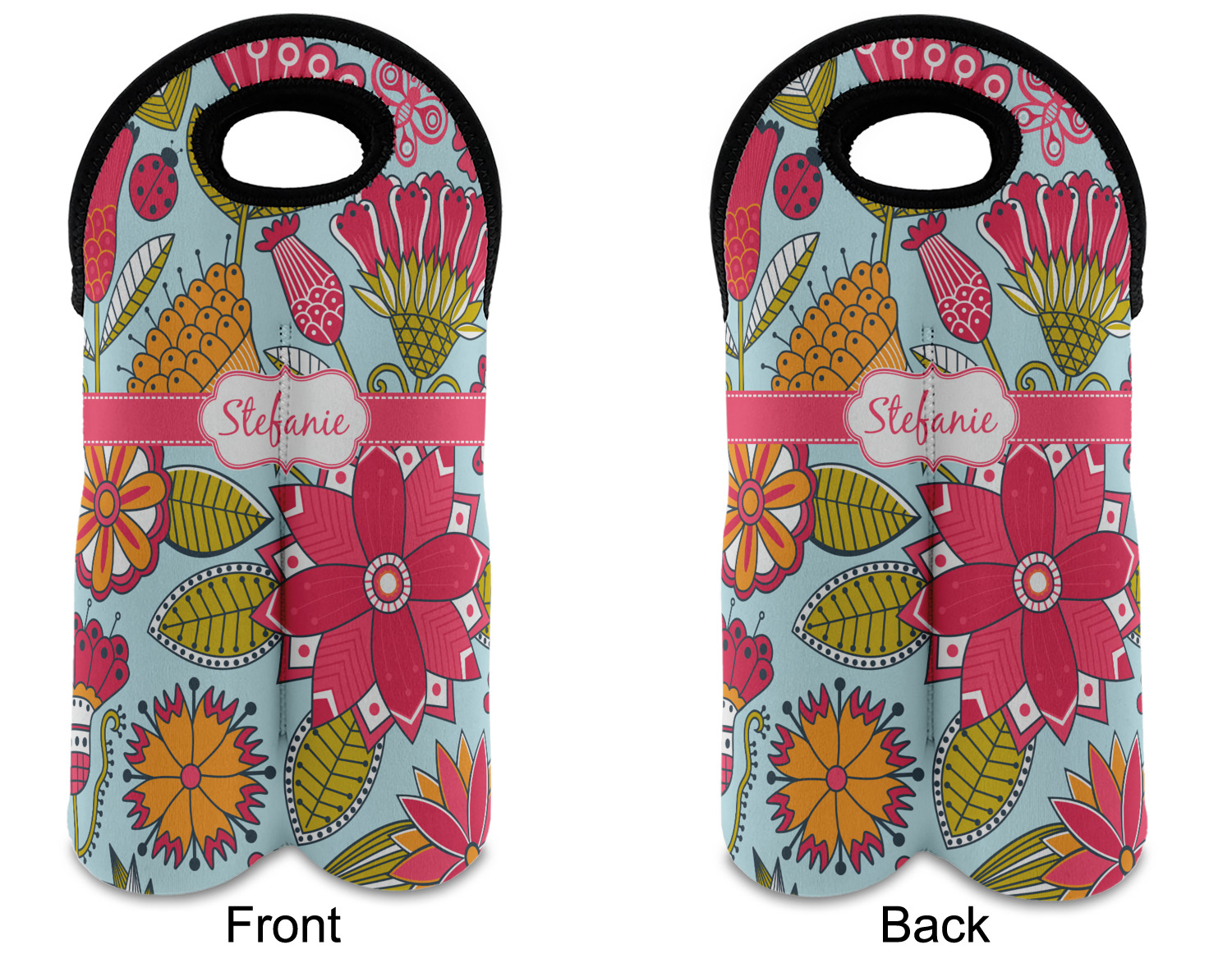 These tote bags are insulated to keep the bottles cold and have a stitched separation down the middle and double handles to keep the two bottles safe and secure during travels.