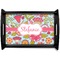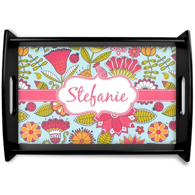 This serving tray with handles features square edges and two rounded sides, creating a very modern look. Each side is fabricated from a beautifully cut, natural wood. The bottom of the interior of the tray displays your customized design in bright, vibrant color. The tray is sold in both a black color and a natural wood look. Each variation of the wood serving tray has two sizes: Small, which is 14" x 10" x 2.25", and Large, which is 19.5" x 13.5" x 2.75".
