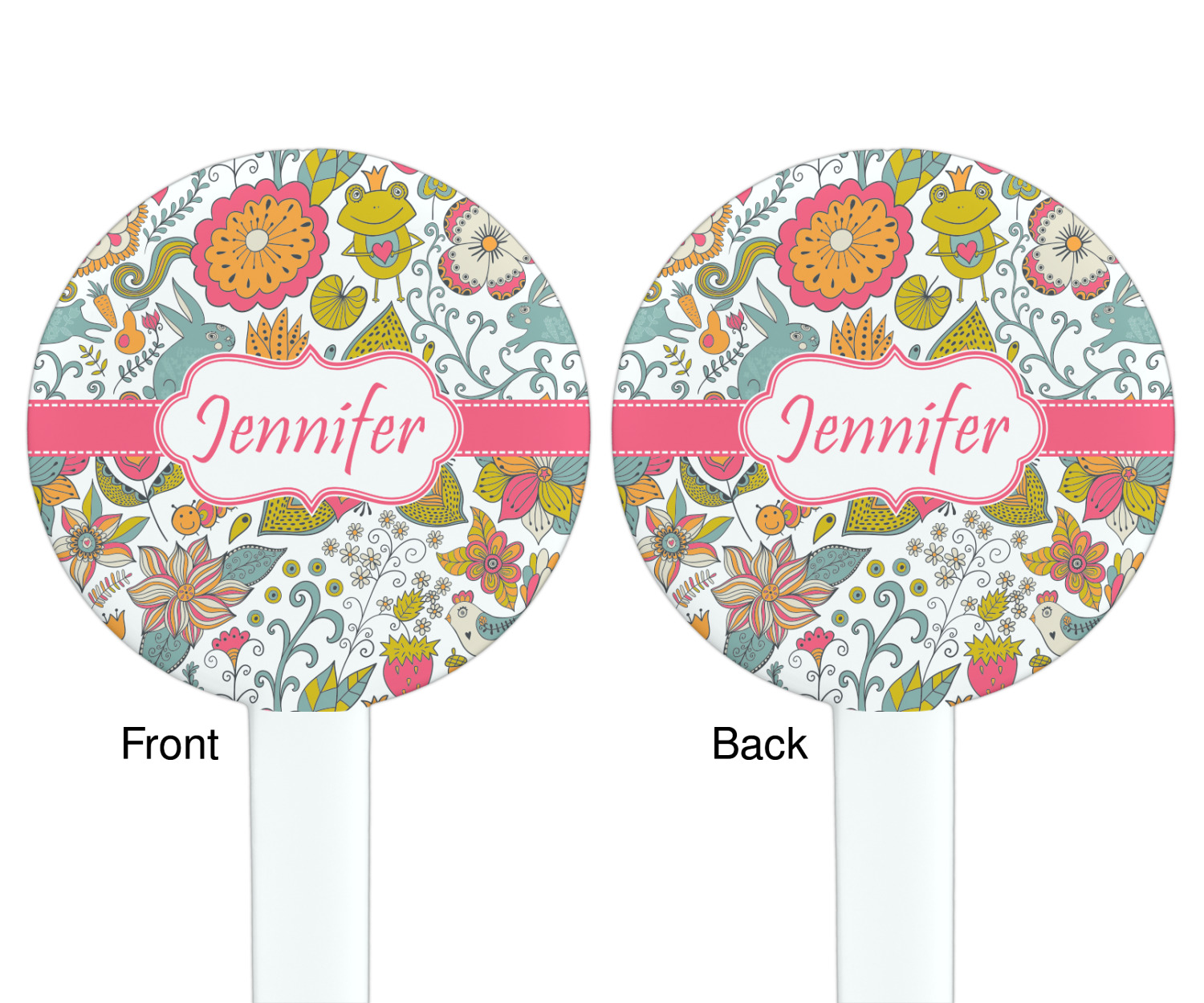 A pink ribbon with white stitching attached to a decorative white label trimmed in pink ties the entire design together. Add personalization of your choice in a coordinating color to make this pattern even more special.