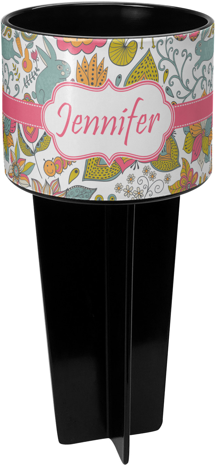 This cup holder has a large stake at its bottom that anchors it to the sand or ground below, while the cup holder rests above the stake. The entire drink holder is made of durable plastic and displays your customization around the cup holder portion. We sell these personalized beach spikers in two different colors: black and white.