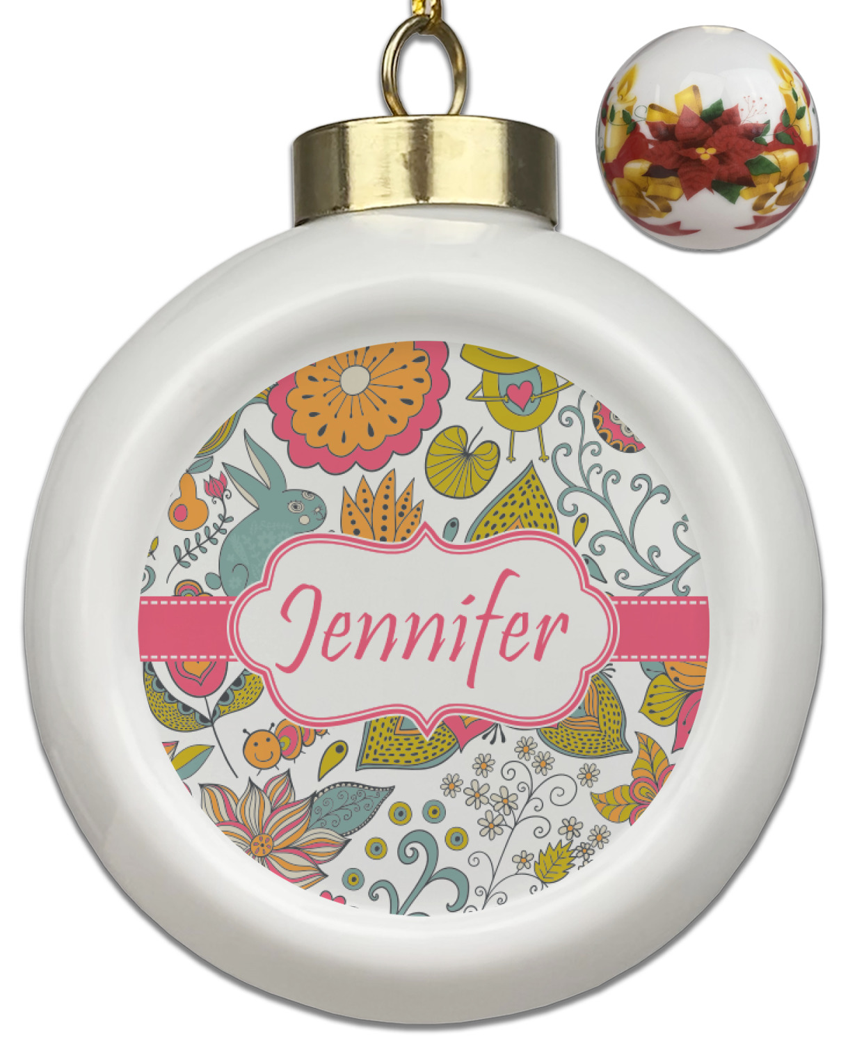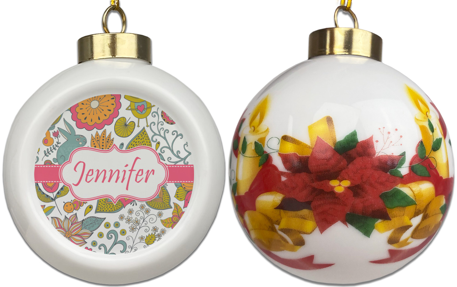 Our Christmas ornaments are a unique ceramic ball shape with a twist as it has a flat face to display your custom design! Select from one of our two design types - Christmas Tree or Poinsettia Garland - to adorn the curved back of your personal design. Each ornament measures 3H x 2.5W x 2D accompanied with a gold string accent for finishing touches to hang on your beautiful Christmas tree!