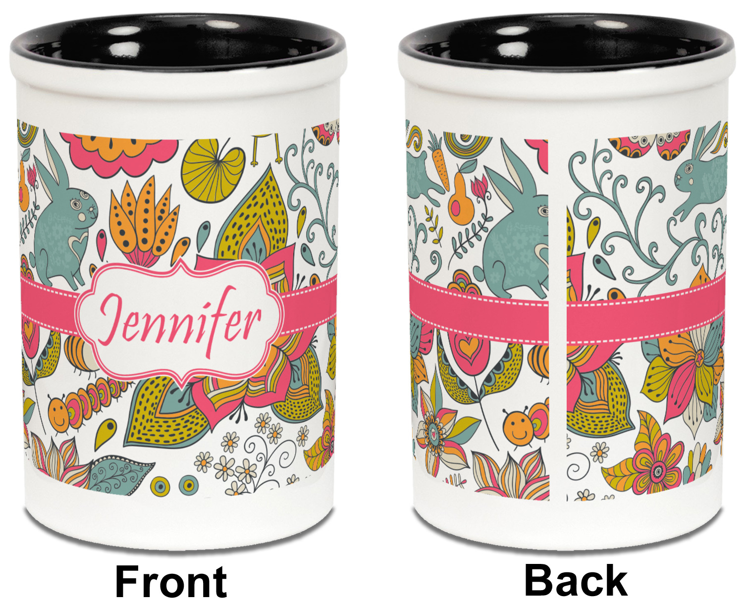 A pink ribbon with white stitching attached to a decorative white label trimmed in pink ties the entire design together. Add personalization of your choice in a coordinating color to make this pattern even more special.