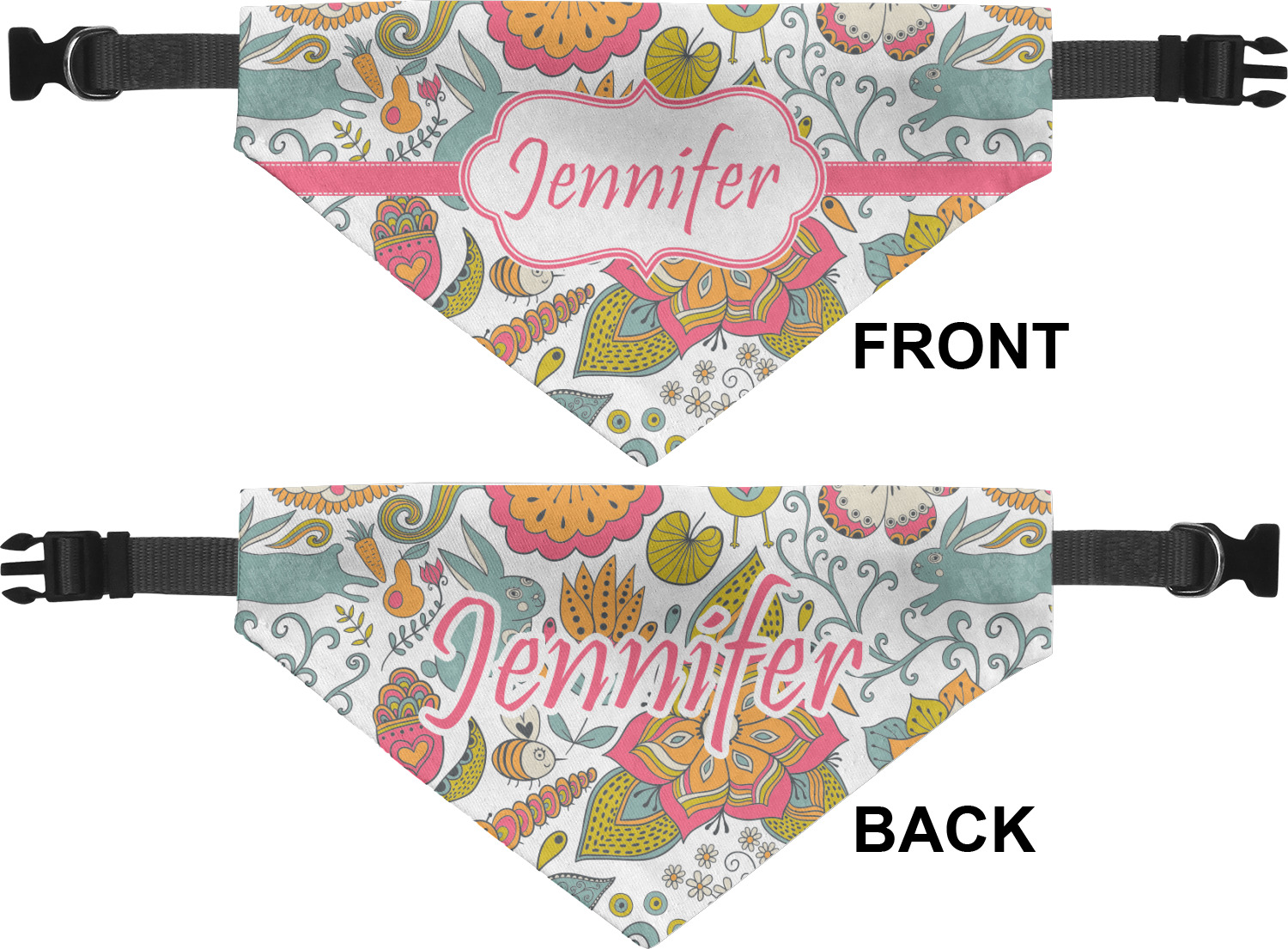 We print the front and back of these dog bandanas with your customized design. The bandana itself is made from a durable polyester, sewn together with a gap large enough to accommodate any collar. Regardless, the bandana includes a plain black, canvas collar with plastic snaps, that can easily be removed if desired. These dog bandana collars are available in four sizes: small, medium, large, and extra large. Please see our sizing chart for more information regarding the dimensions of each size.