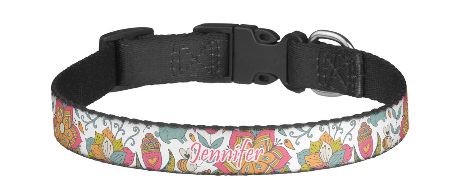 This sturdy collar, made from a durable nylon weave, will outlive your dog's episodes of excited tugging and pulling. Courtesy of its thick plastic buckle and adjuster, this collar is adjustable and accommodating of any dog. Structurally, the collar is a single piece of nylon weave that is sewn together, and features a solid metal loop where you can attach a leash or dog tag. We print and display your dog's name and pattern across the middle of the personalized dog collar.
