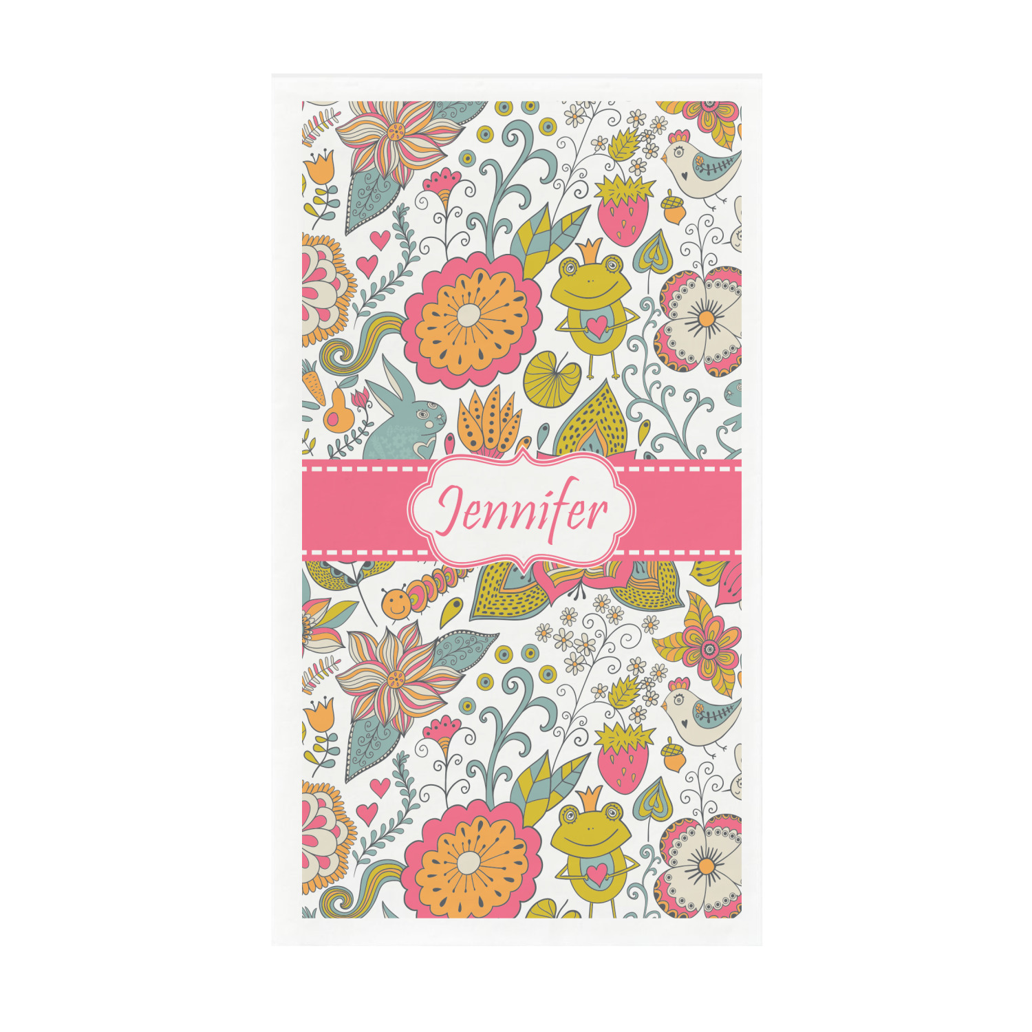 A pink ribbon with white stitching attached to a decorative white label trimmed in pink ties the entire design together. Add personalization of your choice in a coordinating color to make this pattern even more special.