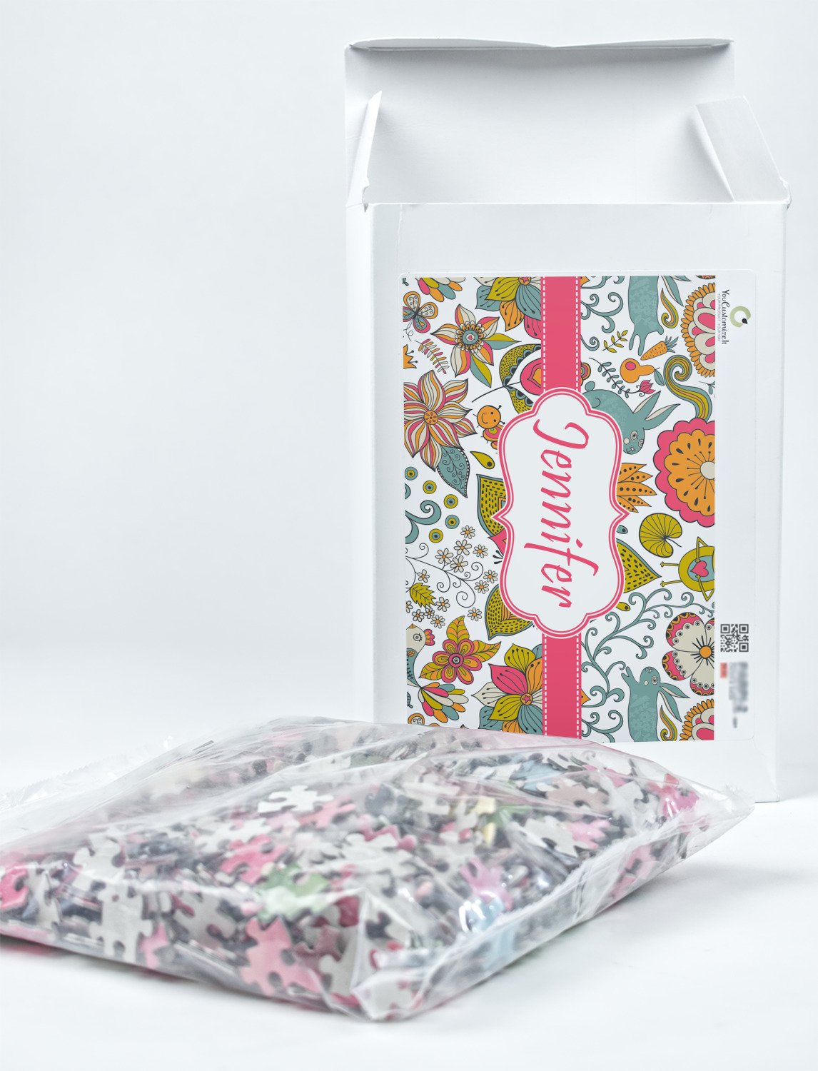 We print our puzzles on thick white chipboard in vibrant colors, then laminate the chipboard and die cut your puzzle. Your jigsaw puzzle is shipped to you in a box with the image of the puzzle on the box.