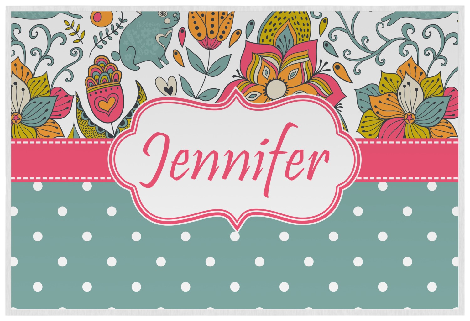 A pink ribbon with white stitching attached to a decorative white label trimmed in pink ties the entire design together. Add personalization of your choice in a coordinating color to make this pattern even more special.