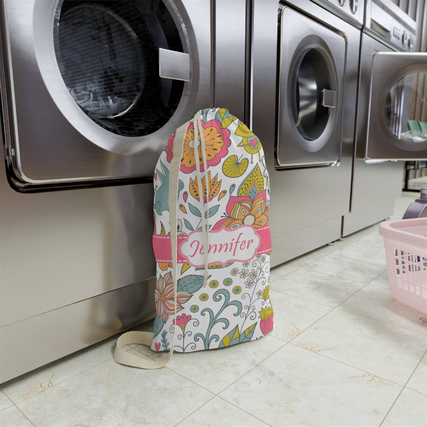 Carry your laundry in style with these customized laundry bags. Available in two sizes, featuring a natural colored woven strap and a cinch cord, these bags hold a lot of clothes or anything else you want to fit in them.