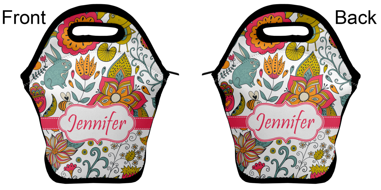 Our personalized lunch bags are made from a strong neoprene, and secure with a zipper closure that lines the top of the bag.The edges of the neoprene are sewn together with a heavy duty stitch, adding to the durability of the bag. The is accompanied by a reinforced handle at its top, for the easy transport of your lunch. We display your personalization across both the front and back of this neoprene lunch bag, while the remaining sides are a sleek black in color. Each bag measures at 13.5 inches tall, and 11.5 inches wide.