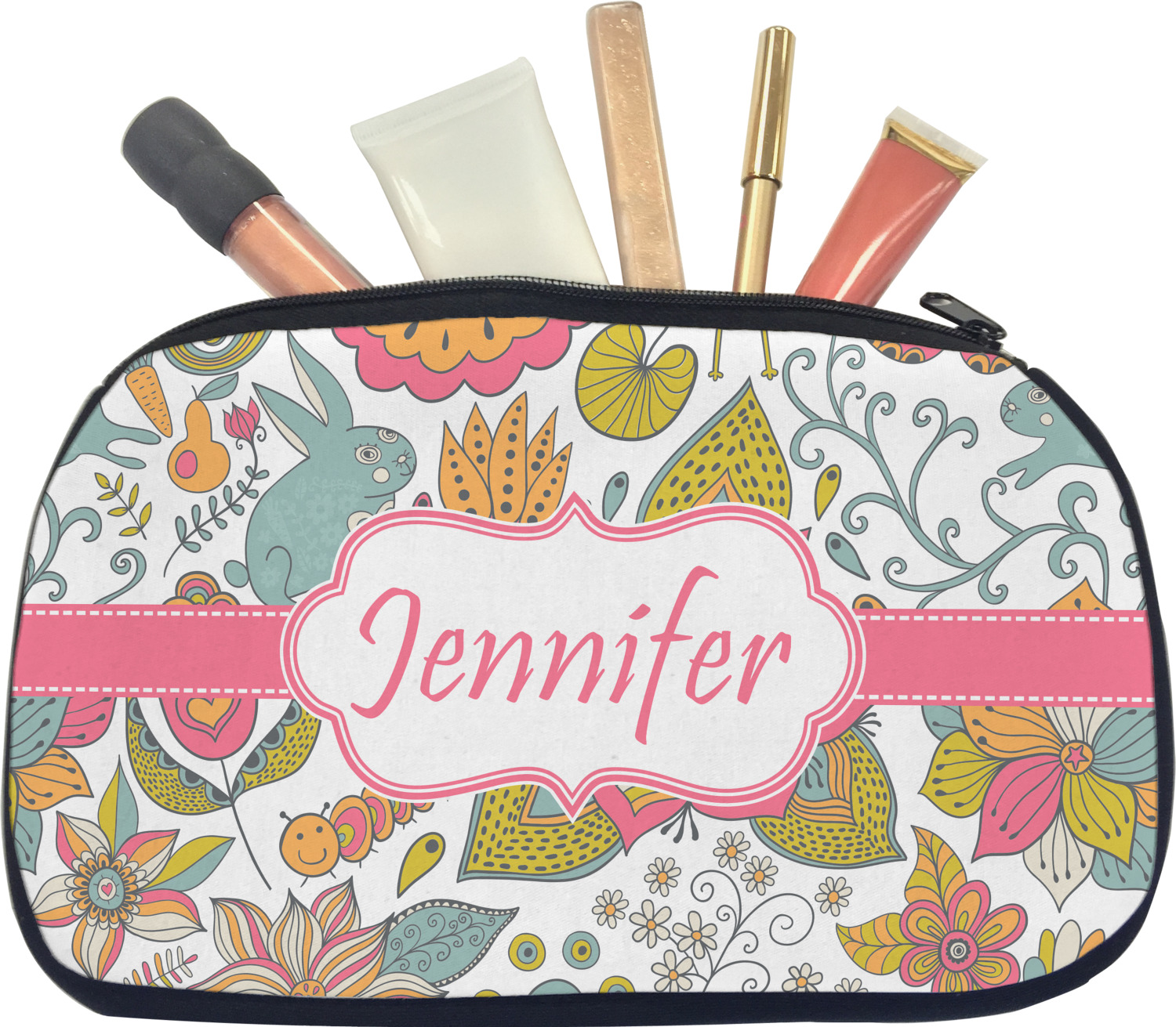 Our personalized makeup bags are available in many different designs, patterns and colors - so you are sure to find one that will love. They are made of neoprene (same material as wet-suits) and thus are water resistant, so spillages in your makeup bag will not end up all over you purse. They are customized on one side and are black on the other side and the zipper is black as well.