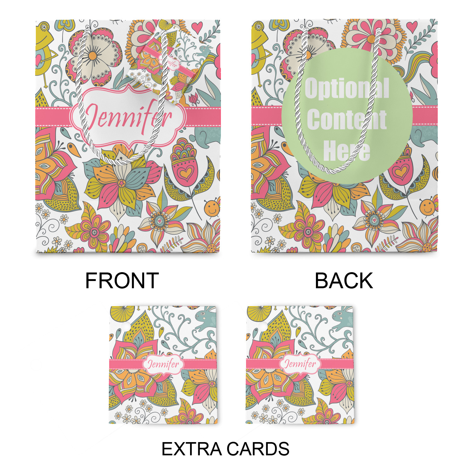 The bottom of the bag has a cardstock base to make the base more sturdy to hold up to all of your gifts. Each bag comes with one card on the rope handle and at least 1 extra card.