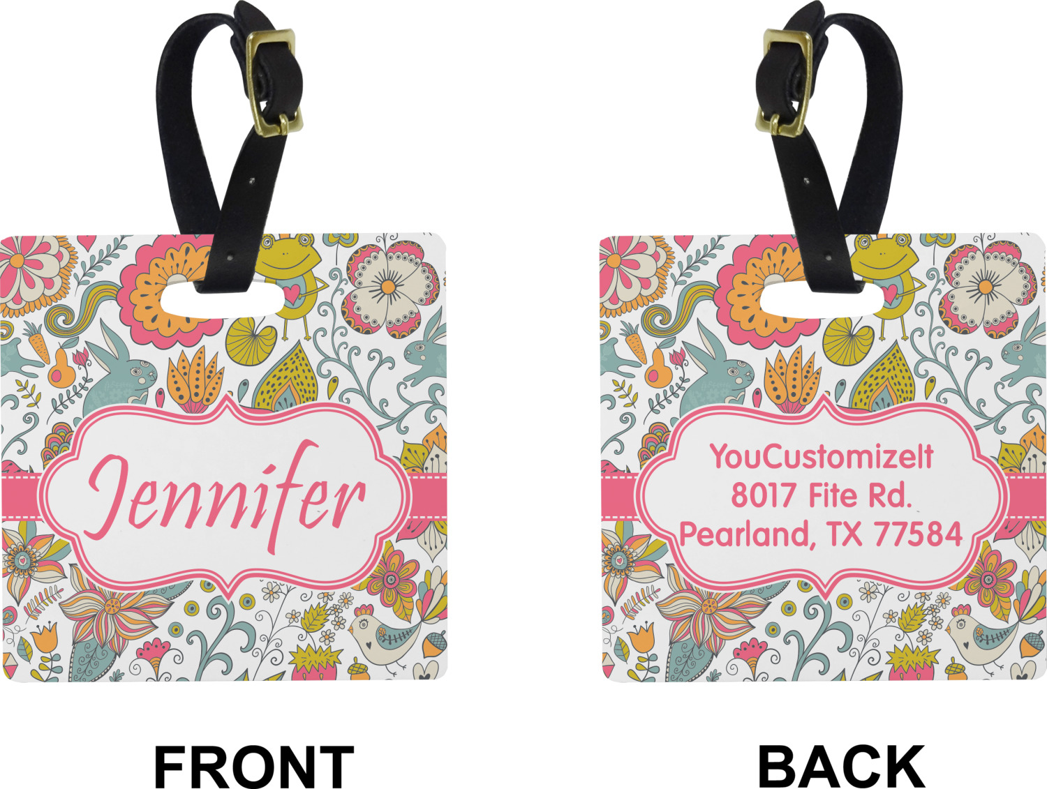 These personalized bag tags are sold in a variety of shapes, so that you may find the product that meets your vision exactly. We sell a round luggage tag, which measures at approximately 4" x 4". Our square luggage tag is about 3.5" x 3.5", while our rectangular version is 2.75" x 4 ".