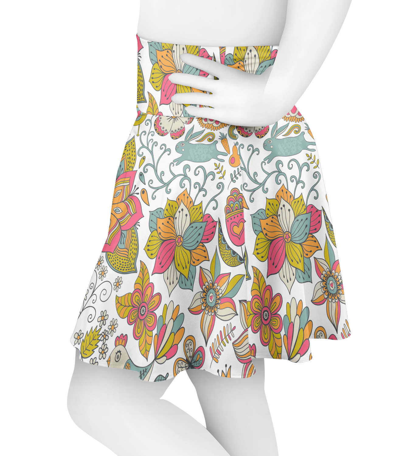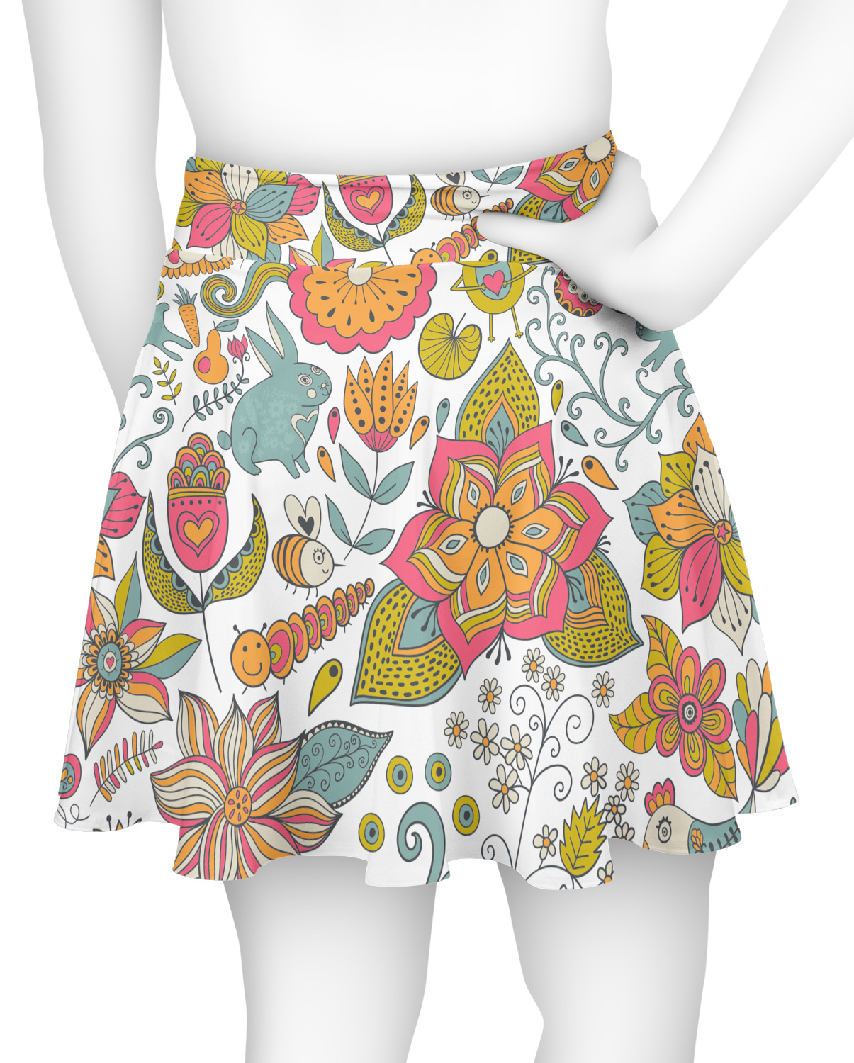 This skirt is a fun skater style that flares out (especially if you take a twirl in it!). The waist band is about 4" thick to wear as a high wasted skirt, but can easily be folded down to become a low waisted skirt. The band hugs you tight while the rest of the skirt is very flowy. The material is a comfortable, casual material that has a very slight sheen to it. It comes in 6 different sizes ranging from XS to 2XL. This skirt is perfect as a casual skirt, but can be easily dressed up to be a more formal skirt.