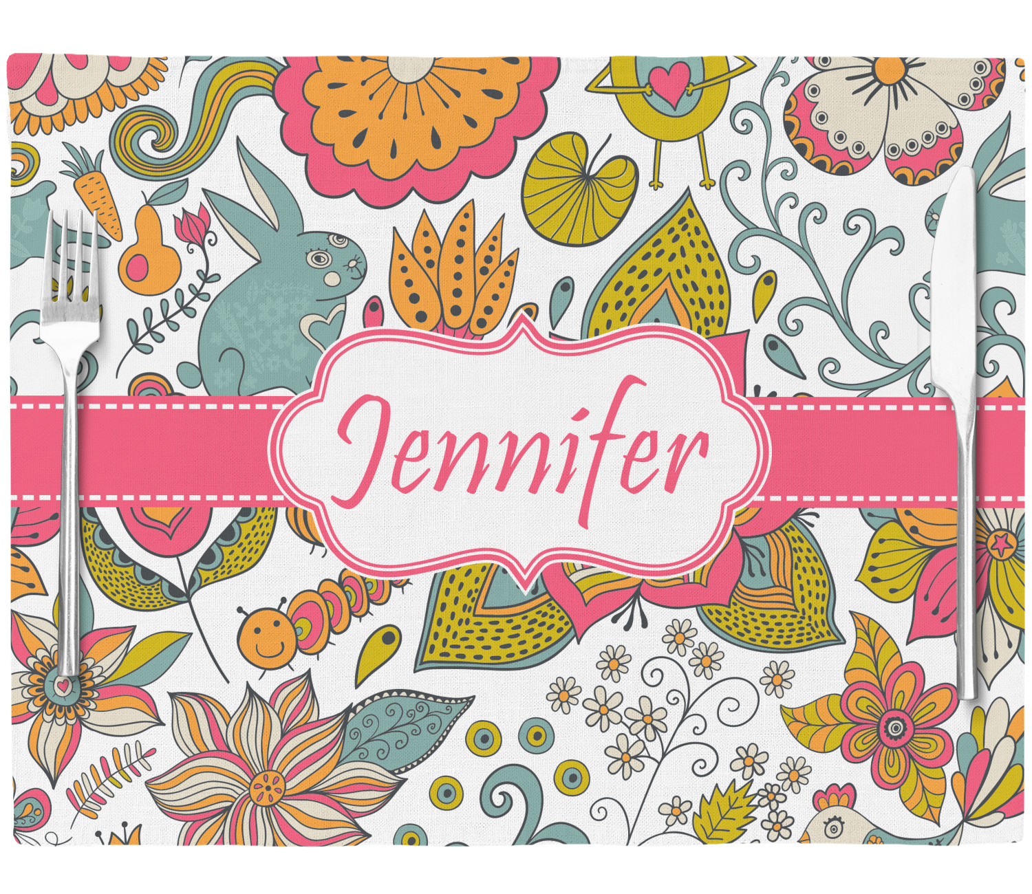 Each of our table mats are a poly twill material with woven burlap detailing. This creates a soft, quality placemat for us to fully print your personalized design across. The woven twill also adds a wrinkle-free surface to set your table! Each customizable placemat is a rectangle shape measuring at approximately 13 x 18 and printed here in the USA.