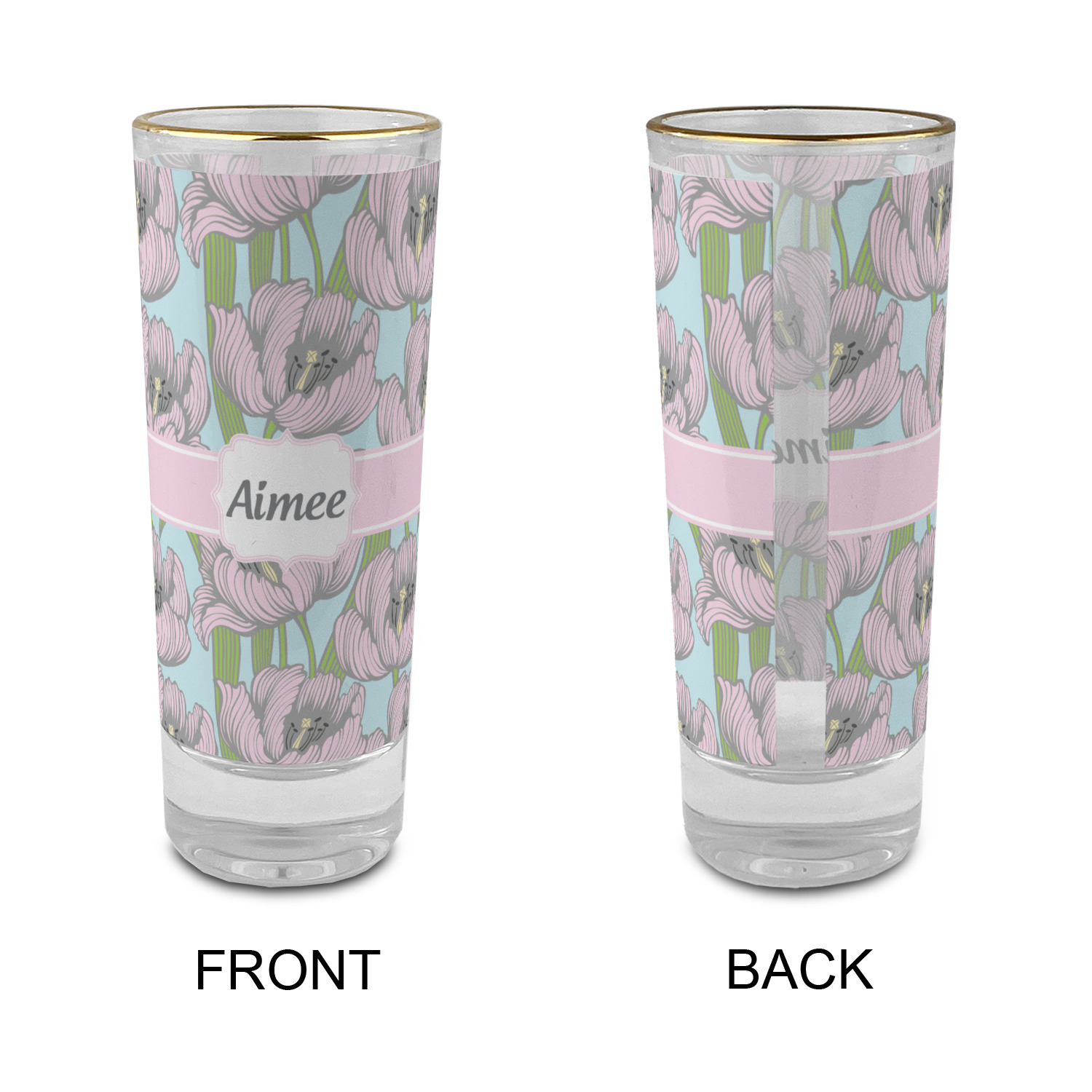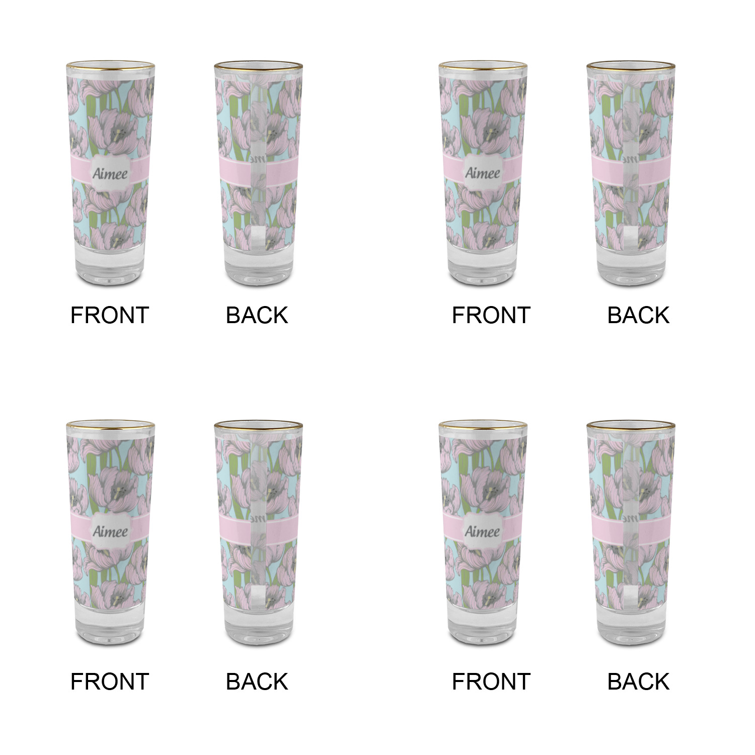 These glass shooter glasses are printed in full color with the design of your choice. These are a tall shooter 2 oz size and stand 4" tall. The print is a full wrap design to boldly display your personalization.