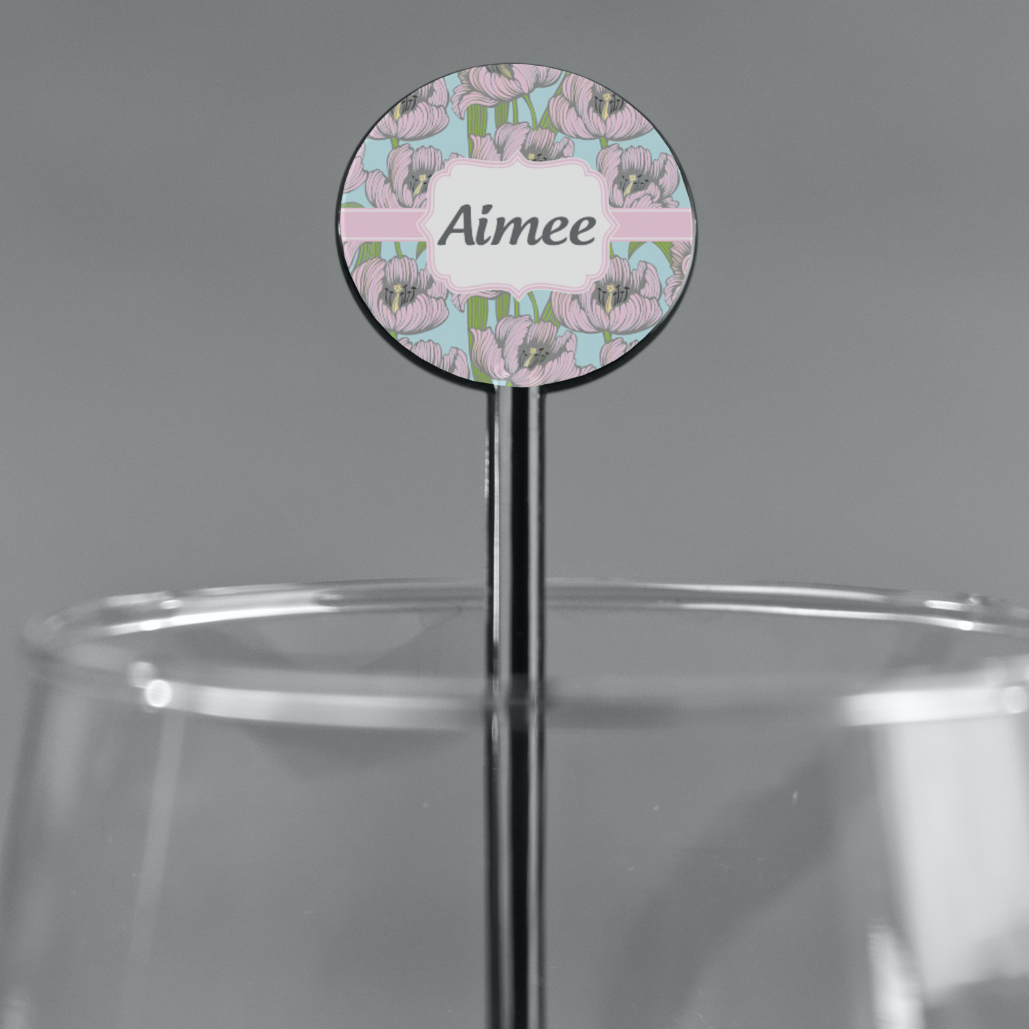 The ribbon and label are coordinated in the soft pink, while the personalization is done in the darker grey.