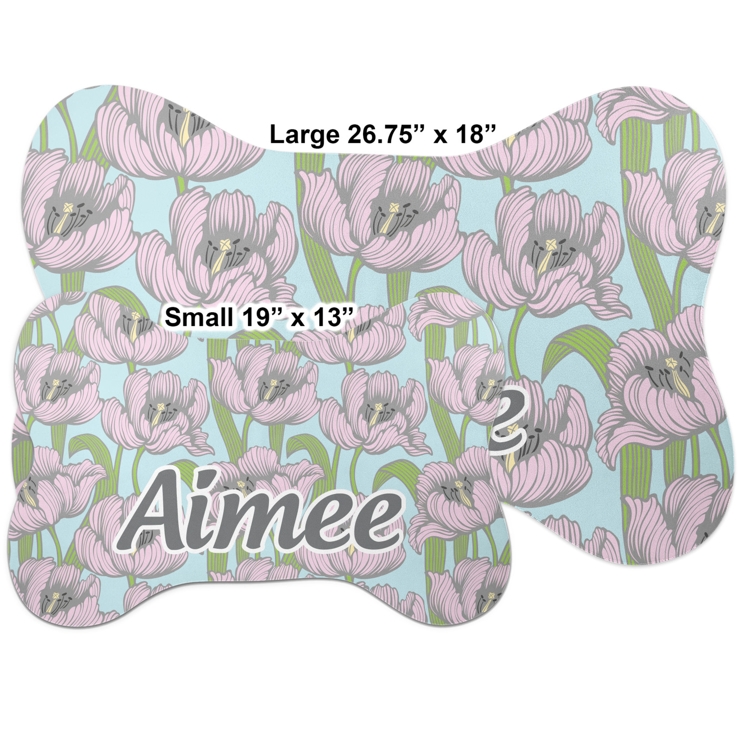 The top of this mat displays your custom design, as it is printed on polyester. To prevent slippage, the underside of the mat is made of rubber. We offer a small dog food mat, suitable for smaller dogs and a large dog food mat for bigger breeds. The small dog food mat is approximately 19 by 13 inches, while the large dog feeding mat measures at approximately 26.75 by 18 inches. Both personalized mats are ideally sized to fit two dog bowls.