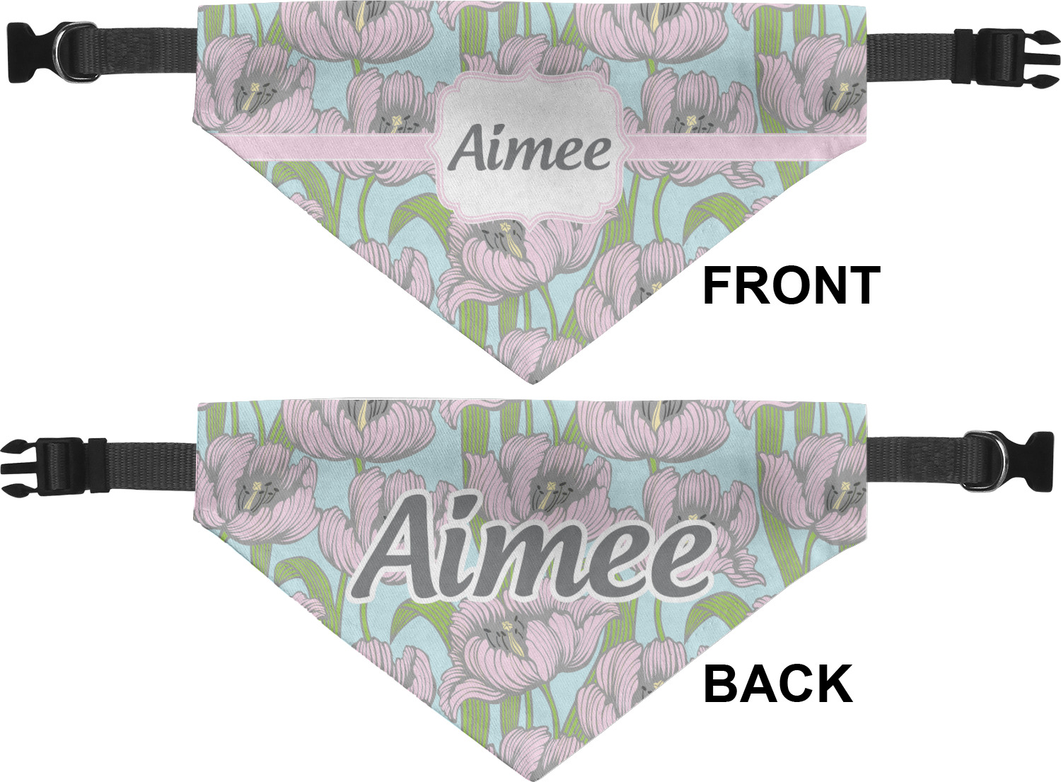 We print the front and back of these dog bandanas with your customized design. The bandana itself is made from a durable polyester, sewn together with a gap large enough to accommodate any collar. Regardless, the bandana includes a plain black, canvas collar with plastic snaps, that can easily be removed if desired. These dog bandana collars are available in four sizes: small, medium, large, and extra large. Please see our sizing chart for more information regarding the dimensions of each size.