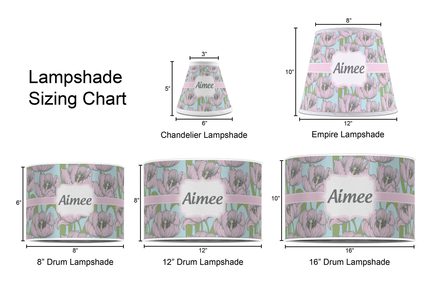Our customized lamp shades also come in 3 different sizes: 8", 12" and 16", measuring at 8" in diameter by 6" tall, 12" in diameter by 8" tall, and 16" in diameter by 10" tall, respectively.