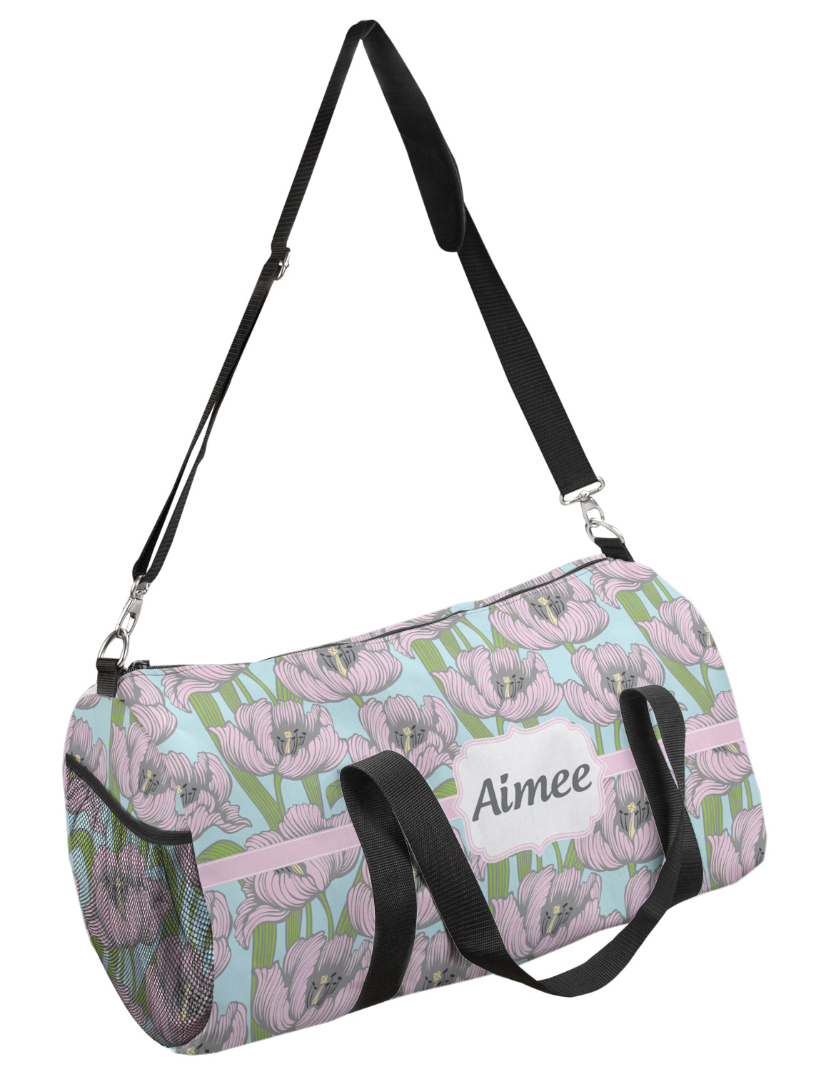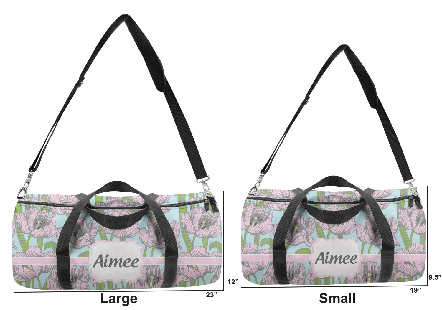 This duffle is a sturdy bag made of a canvas material. It comes in two sizes: Small (19"W x 9.5"H x 9.5"D) and Large (23"W x 12"H x 12"D). The bag is a cylindrical shape with a black adjustable strap and two handles. On one side is an elastic pouch to put a waterbottle or other small item. Your product will be sublimated with your design and is able to be designed on the front, back, and sides. Be sure to remember that the straps may cut into parts of your design if you upload your own artwork.
