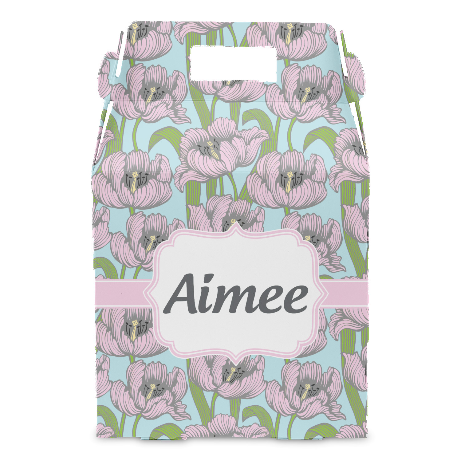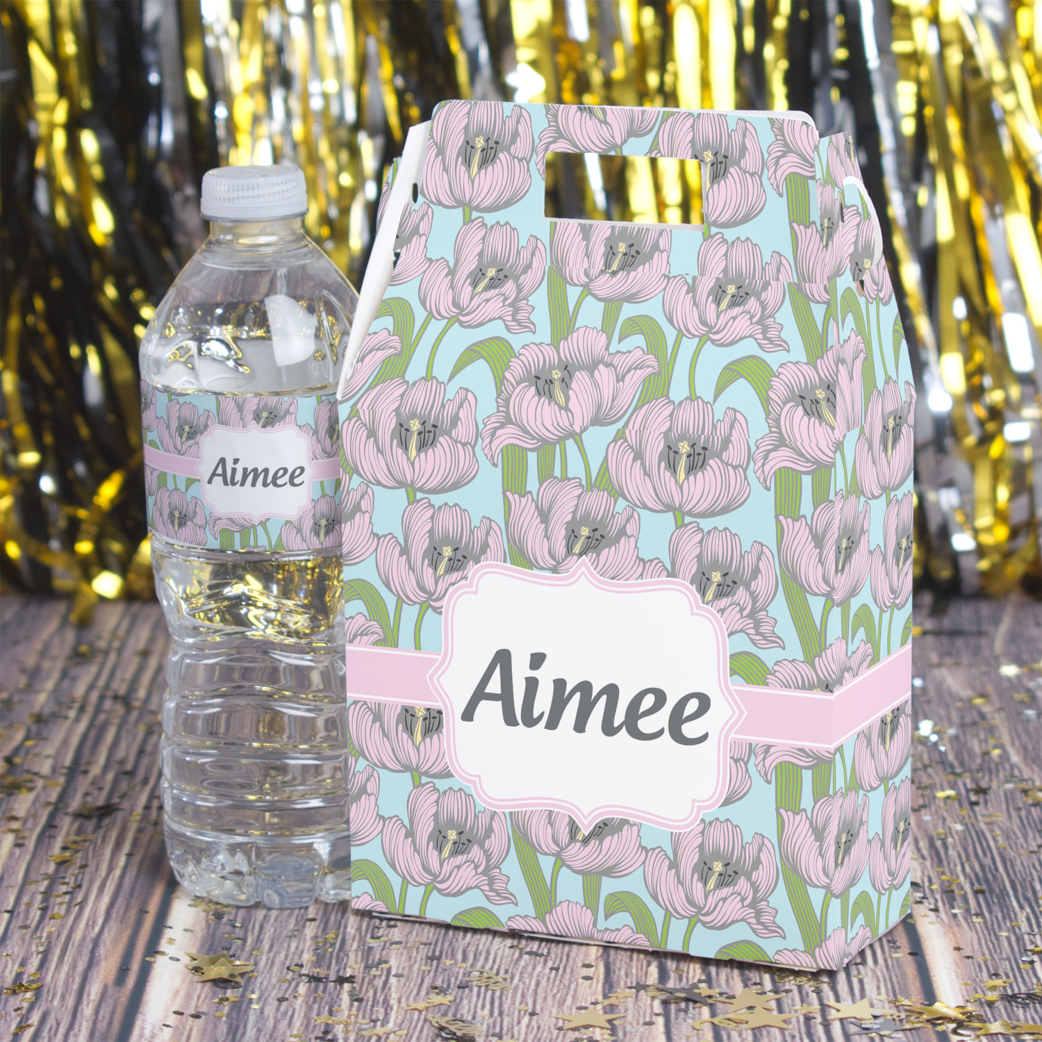 The ribbon and label are coordinated in the soft pink, while the personalization is done in the darker grey.