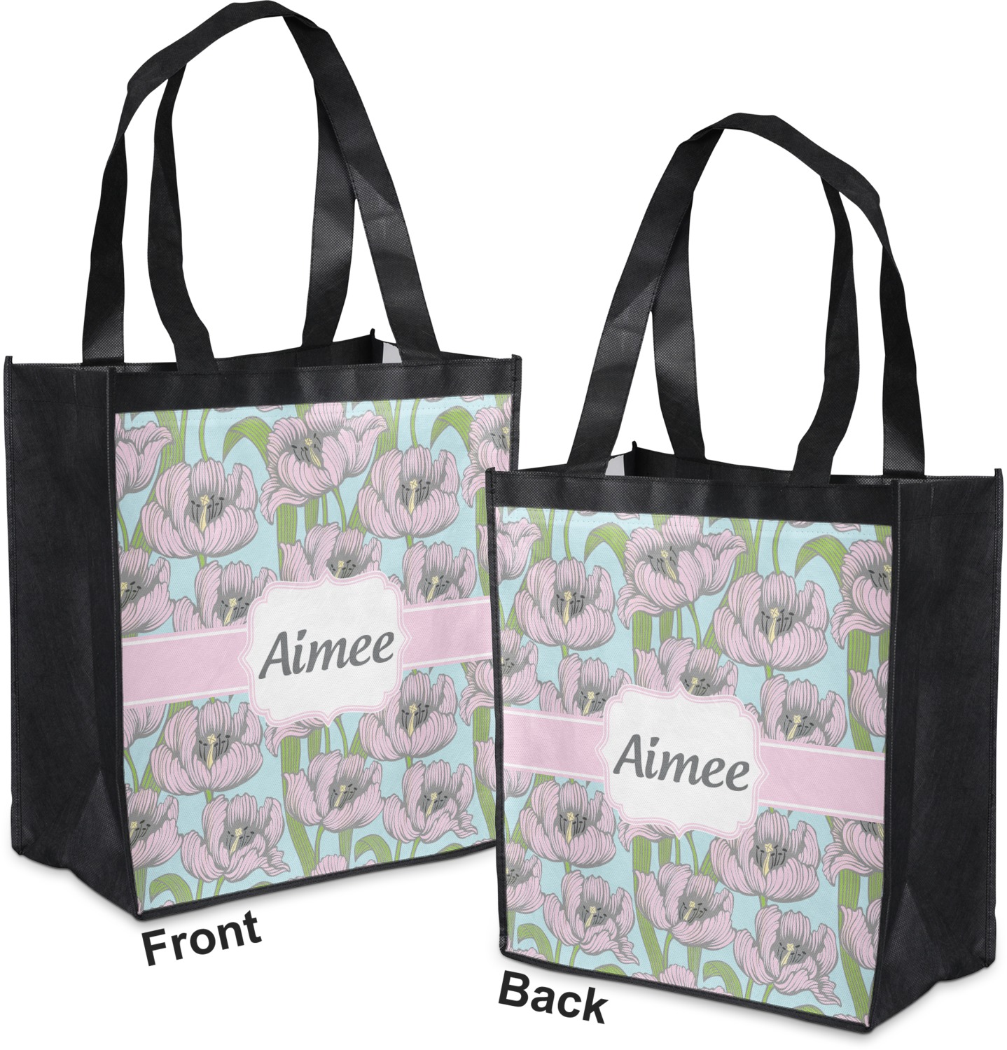 Made from a durable, biodegradable material, these reusable shopping bags can support up to 30 pounds of weight. With two large handles, measuring at 8.5 inches each, these personalized tote bags are easy to carry to your vehicle or home. The bag itself is 12 by 13.5 inches, and can expand to a depth of 7 inches. Your customization is printed on both the front and back, while the remaining sides, trim, and handle are a sleek, charcoal black.