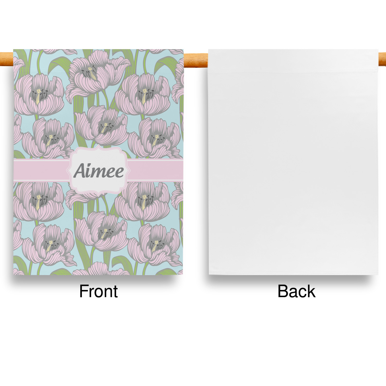 These custom garden flags are made of a durable, double-ply, polyester weave, allowing them to withstand the elements year round. The small flags measure at approximately 12 by 18 inches. The large flags measure out to 28 by 37 inches. You can order these decorative flags with your customization printed on the front only, or the front and back.