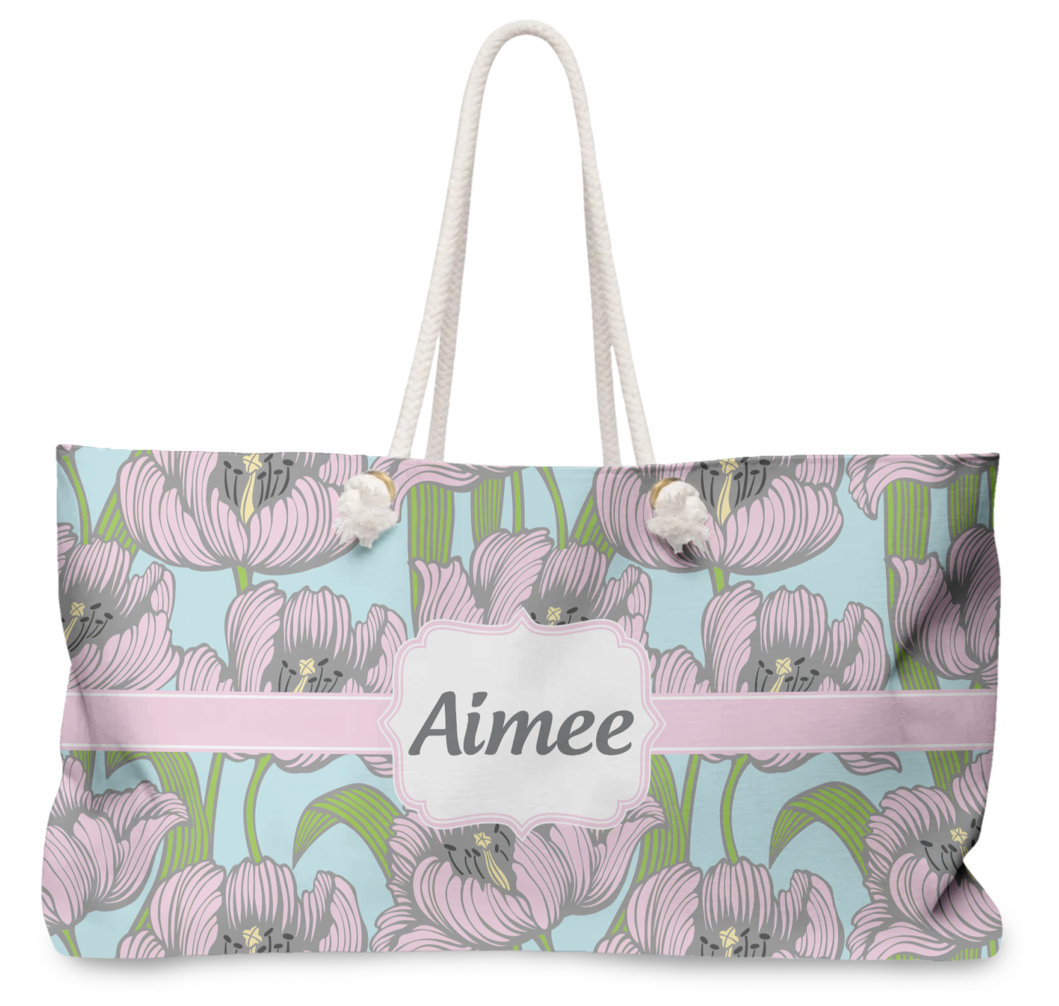 Our oversized weekender tote with rope handles is perfect for your weekend at the beach or on the town. This large tote are 24" W X 13" H, with a 5" gusset and a 27" thick rope handles with a knot that is put through a grommeted brass hole.